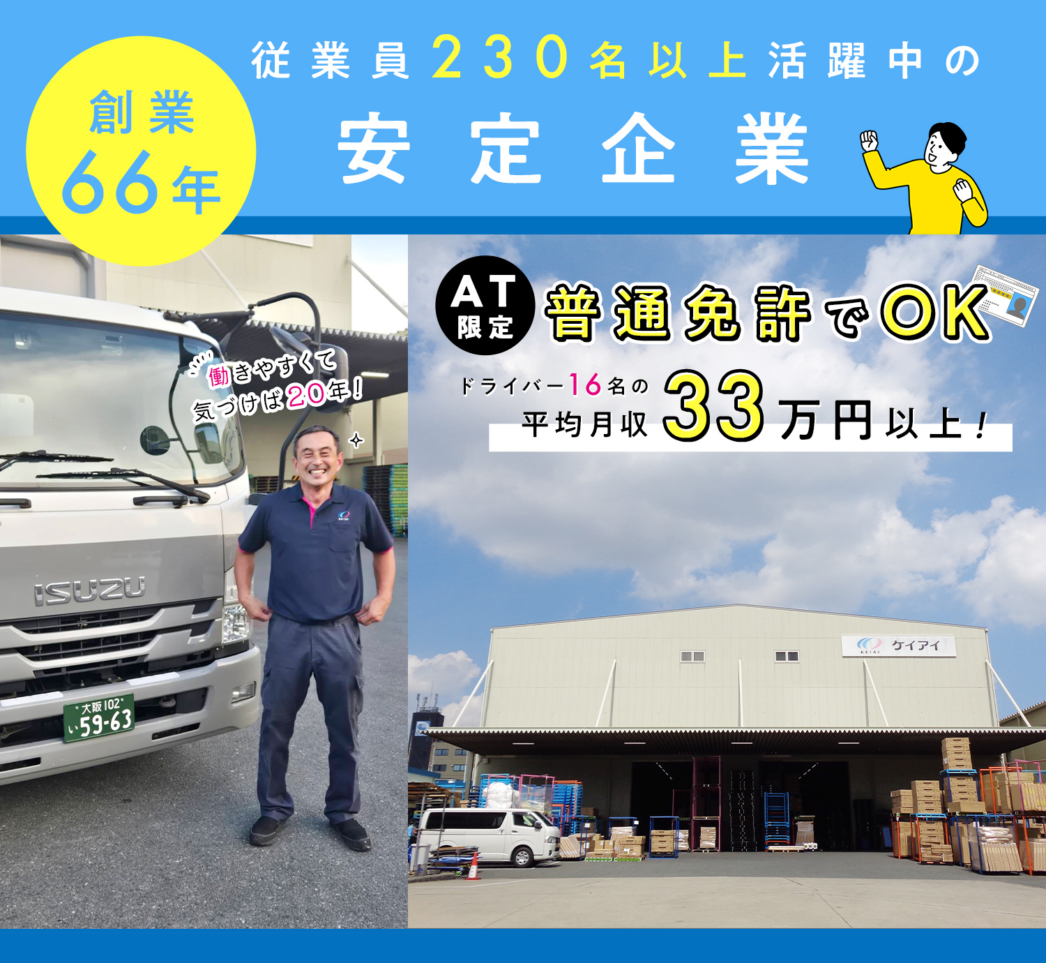 応募資格 | 普通自動車免許でOK!(AT限定可・免許の取得時期不問) ※ドライバー未経験OK ※年齢不問(シニアやミドルも活躍中) ※学歴不問 ※軽作業や事務等から転職OK ※普通免許取りたての方も応募OK! 入社後に、会社全額負担で中型免許の取得可能! 中型免許取得までは、ハイエースでの配送や先輩の助手席に乗る横乗り、倉庫業務をしていただきます。 |