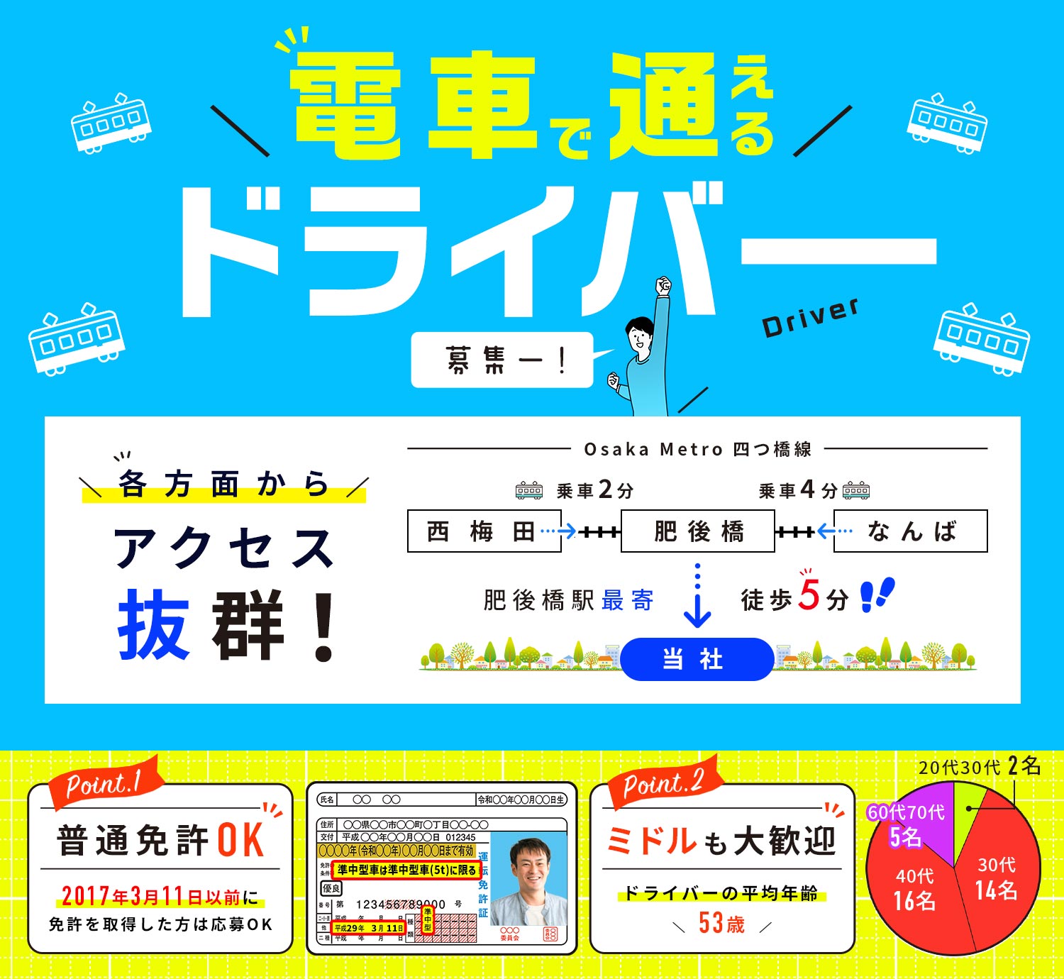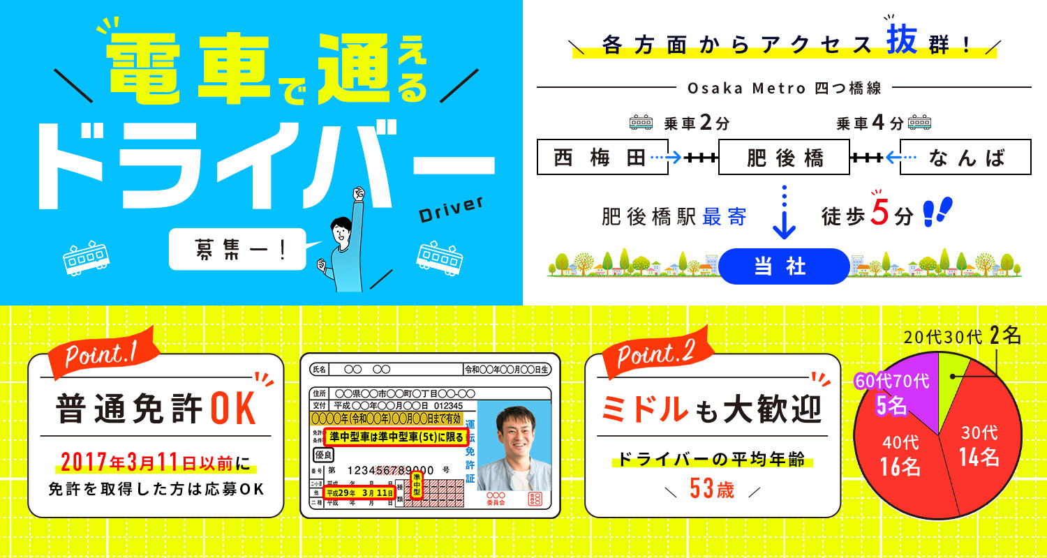 応募資格 | 普通自動車免許でOK ※平成29年(2017年)3月12日以降に普通免許を取得した方は要準中型免許 #ブランクOK ※年齢・学歴不問 ※シニアやミドルも歓迎 |