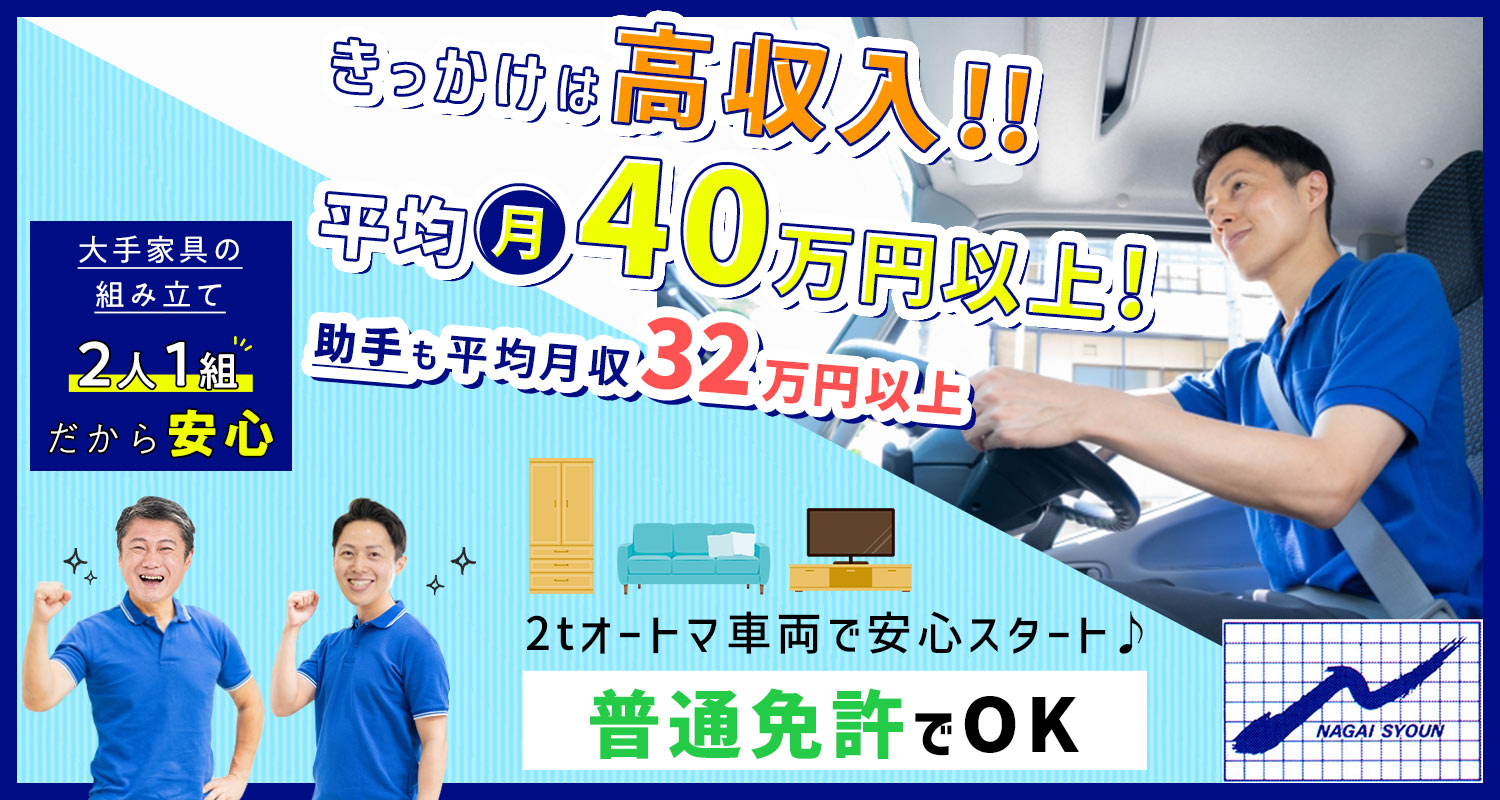 | 仕事内容 | シニアやミドルも歓迎の配送助手/軽作業などから転職もOK[契] 家具の配送助手のお仕事をお願いします。 ドライバーが運転するトラックに同乗してお客様宅へ伺い、 協力して商品の搬入・設置を行います。 到着後は設置場所の寸法を測ったり、搬入経路を把握したりもします。 お客さまのご要望によっては、組み立てまでしていただく場合もありますが、 そちらも丁寧に教えます! ※二人一組となり、1日12件程度の配送をお願いします。 ※重量物はドライバーさんと二人で運びます! 【1日のスケジュール例】 7:00 朝礼 8:00 配送出発(6件程度配送) 12:00 お昼 13:00 配送再開(6件程度配送) 17:30 帰社(段ボールなどの片付け、翌日の積込み/15分~45分程度) 18:00 終了 ※実際に体を動かす時間は3~4時間程度! |