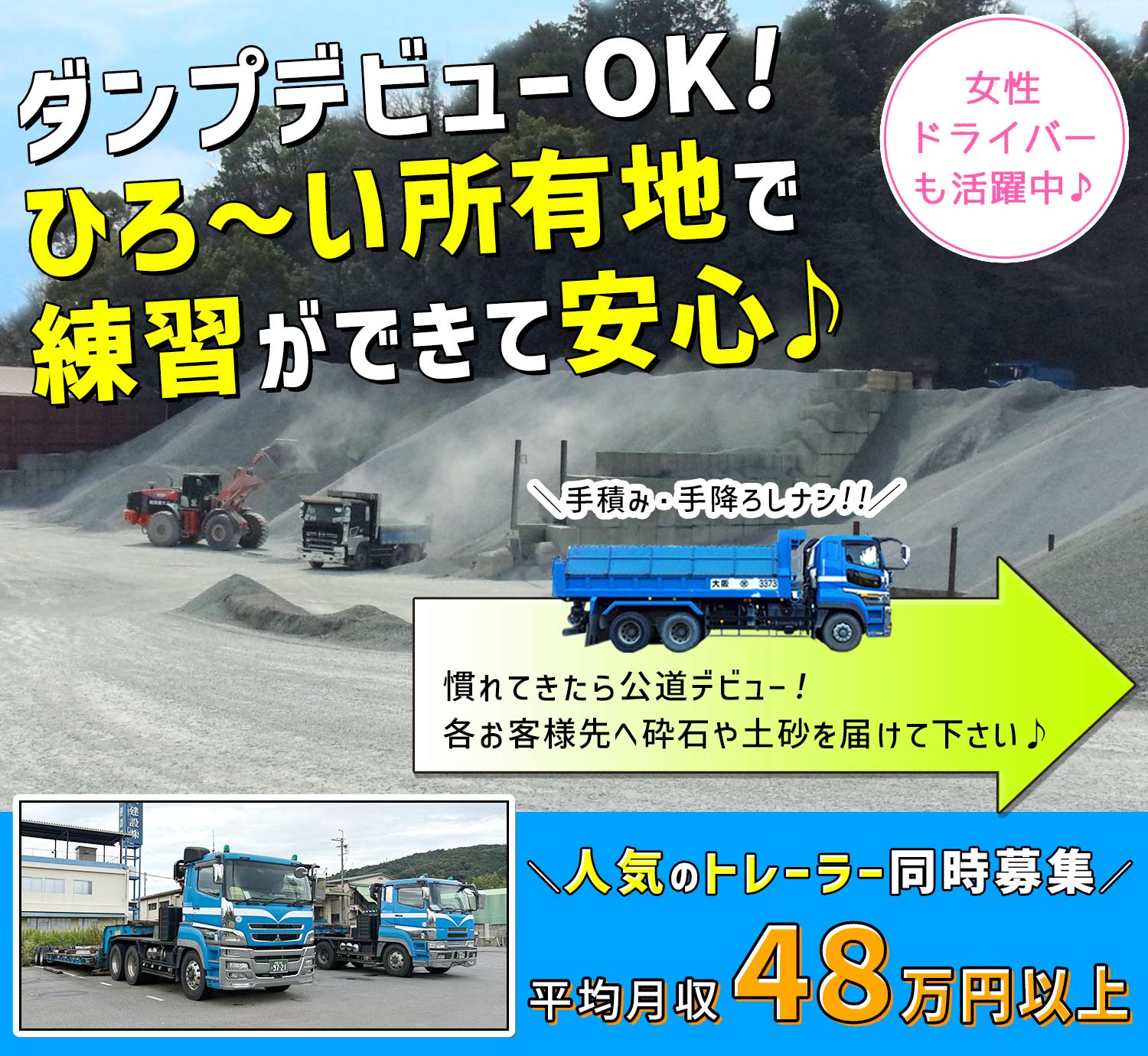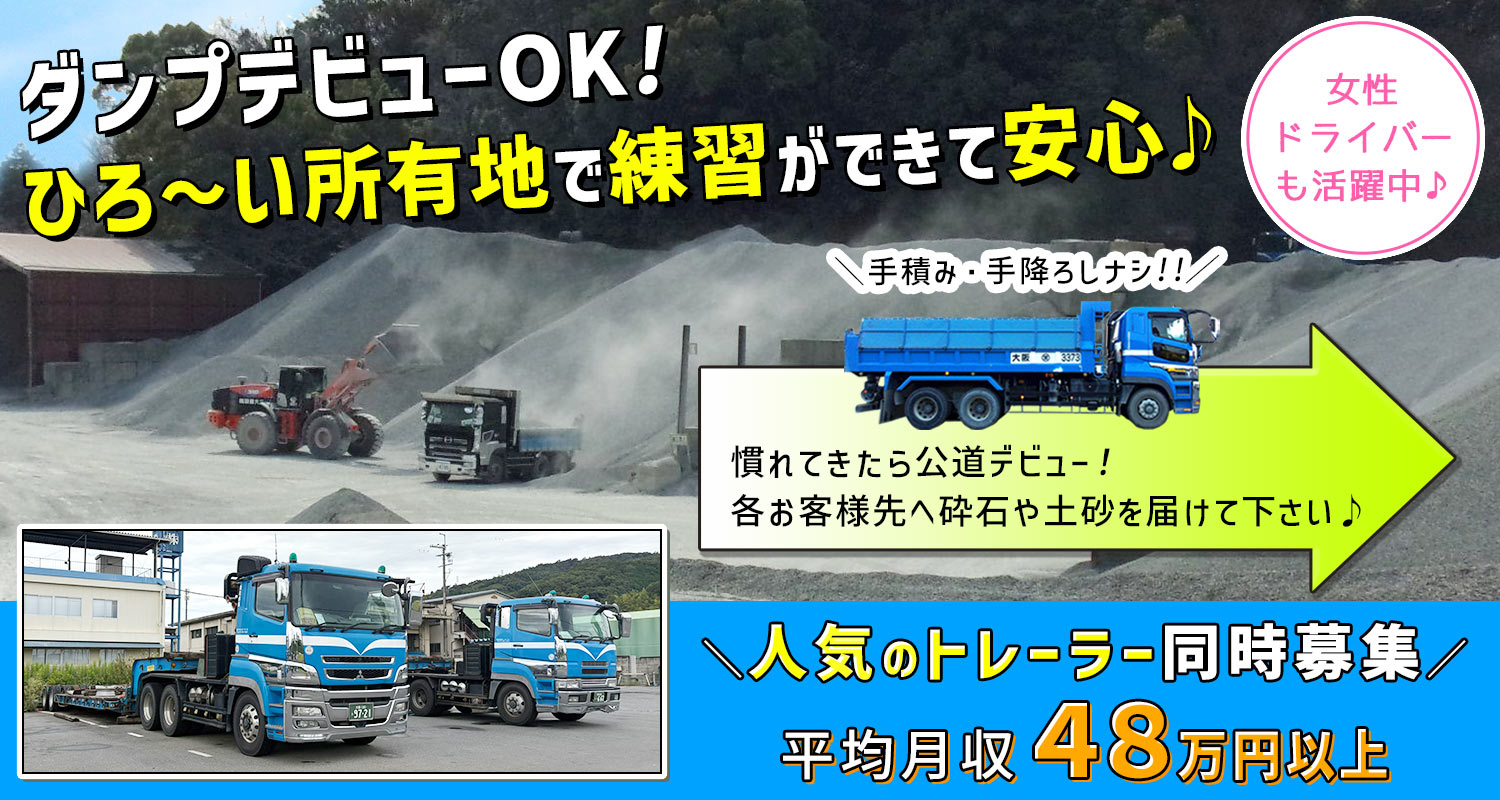 仕事内容 | ダンプドライバー[社] 建築現場で使用される砕石・土砂の運搬業務。 ※配送先は大阪府下メイン ※手積み・手降ろしなし ※一人一台の専用ダンプあり ※高速代を含め、業務を行う上での自己負担は一切ありません! ※自社に整備士が在籍しており、安心して業務に取り組めます! □□□ ※サイト内で『土日祝休みのダンプドライバー[社]』の募集広告あり! |