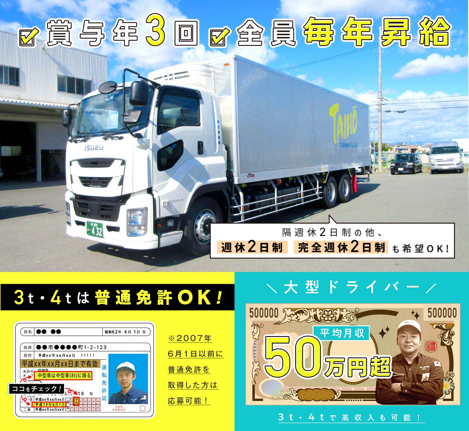 応募資格 | 要普通自動車免許 ※平成19年(2007年)6月1日以前に普通免許取得の方は4tまで運転可能! 平成19年(2007年)6月2日以降に普通免許取得の方は要中型自動車免許 ※ドライバー未経験OK |