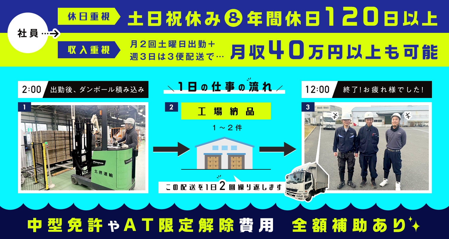 | 応募資格 | 普通自動車免許でOK ※取得時期は不問!AT限定もOK AT限定の方や、2007年(平成19年)6月2日以降に普通免許を取得された方は、免許取得支援制度にて限定解除や中型免許の取得可能!(費用全額会社負担※規定あり) ※ドライバー未経験大歓迎 ※軽作業や事務等から転職OK ※学歴不問 #ブランクOK |