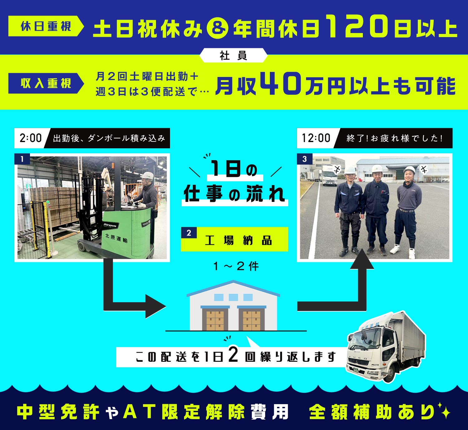 | 待 遇 | #賞与あり 業績による 社会保険完備 交通費支給(1日上限1000円) #車通勤OK バイク・自転車通勤OK 資格取得支援(AT限定解除・中型免許・フォークリフト免許が全額会社負担で取得可能) ※規定あり 制服貸与 親睦会あり |