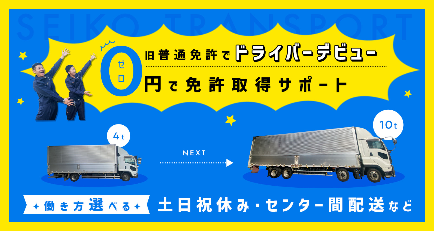 | 応募資格 | 大型自動車運転免許 ※旧普通免許(2007年6月1日以前の普通免許)をお持ちの方も応募OK! まずは4トンからスタートします。 免許取得支援で『¥0』で大型免許の取得後 大型ドライバーとして活躍もできます! ※年齢不問(シニアやミドルも歓迎) ※男女OK ※配送経験不問 |
