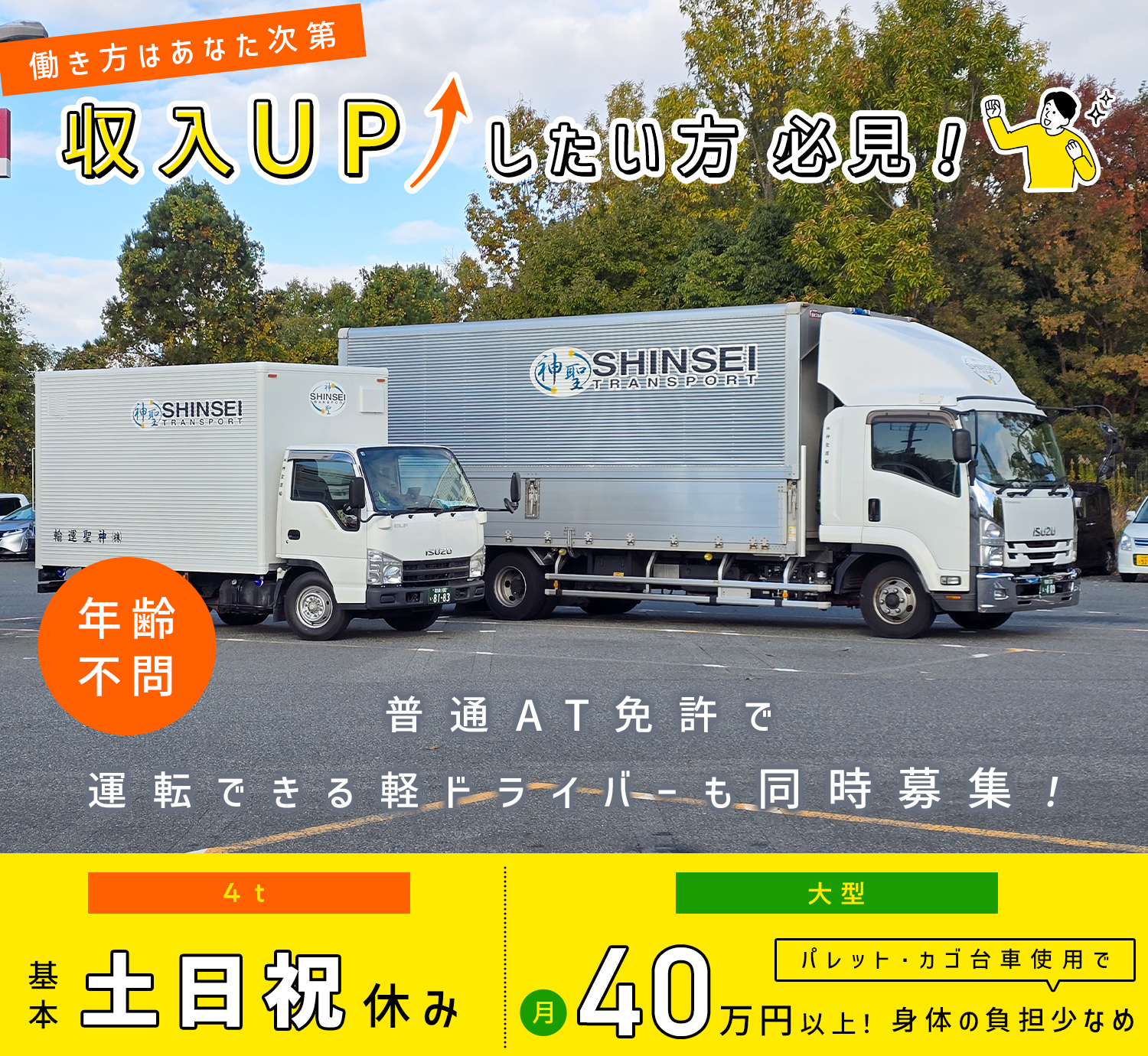 | 応募資格 | 普通自動車運転免許 ※平成19年(2007年)6月1日以前に取得の場合 平成19年(2007年)6月2日以降に取得の方は要中型免許 ※ドライバー未経験OK ※年齢不問!シニアやミドルも歓迎 ※職歴・学歴不問 ※異業種やブランクある方も転職OK  |