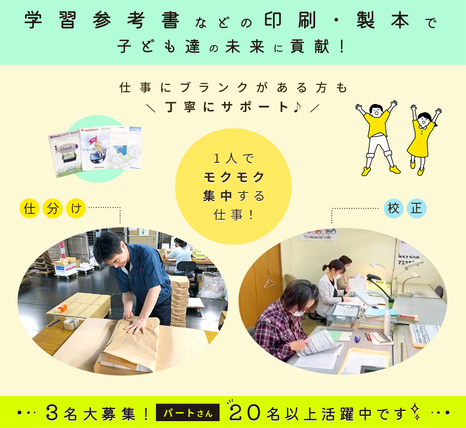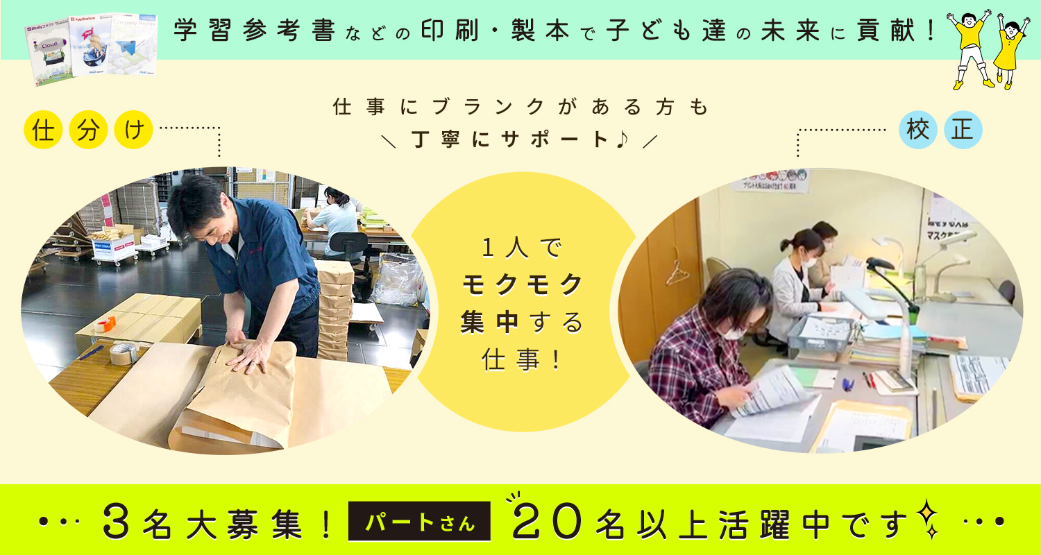 | 仕事内容 | (1)仕分け・軽作業/パート[パ] (2)校正・パート/事務等から転職OK[パ] (1)学習塾で使用する教材の印刷・製本を行う当社で、仕分け・梱包・出荷準備などをお願いします。 ★具体的には… ・製品を包装紙で丁ねいに包む ・送り先ごとに製品を仕分け ・段ボールに製品を詰める など (2)参考書や問題集などの原稿の印刷前後の「校正」をお願いします。 ★具体的には… ・原稿データを印刷機にかける前のチェック/お客様から依頼のあった原稿と、印刷データに相違がないか確認 ・原稿データを印刷後(製本後)のチェック/原稿データ通りに出来上がっているかの確認や、汚れがないかの確認 など ほとんどの方が未経験からの入社です◎ 1人で黙々と集中して行う仕事なので、そういう働き方が好きな方はぜひお越しください! |