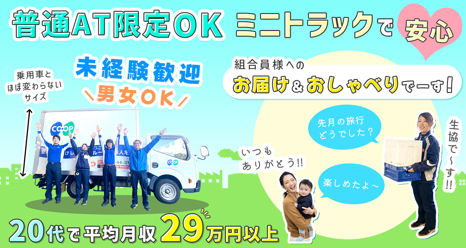 | 仕事内容 | 会員専属のミニトラックドライバー/事務等からも転職OK[社] 当社の配送ドライバーとして、コープこうべの組合員様に対する生協商品の配送をお任せします。 ※決まったコースのルート配送です。 ※再配達ナシ!! 配送件数:1日約50件(コースによって異なる) エリア:半径1Km程度の狭いエリア ※担当コースは3年毎に変更予定 □□□ <1日のスケジュール例> Aコース 07:30~ 積み込み作業 09:00~ 配送スタート(約50軒ほど) 12:30~ お昼休憩 17:00~ 配送終了後、注文書の処理 19:30~ 退勤 Bコース 07:30~ 積み込み作業 09:00~ 配送スタート(約50軒ほど) 12:30~ お昼休憩 17:00~ 配送終了後、注文書の処理 16:00~ 退勤 |