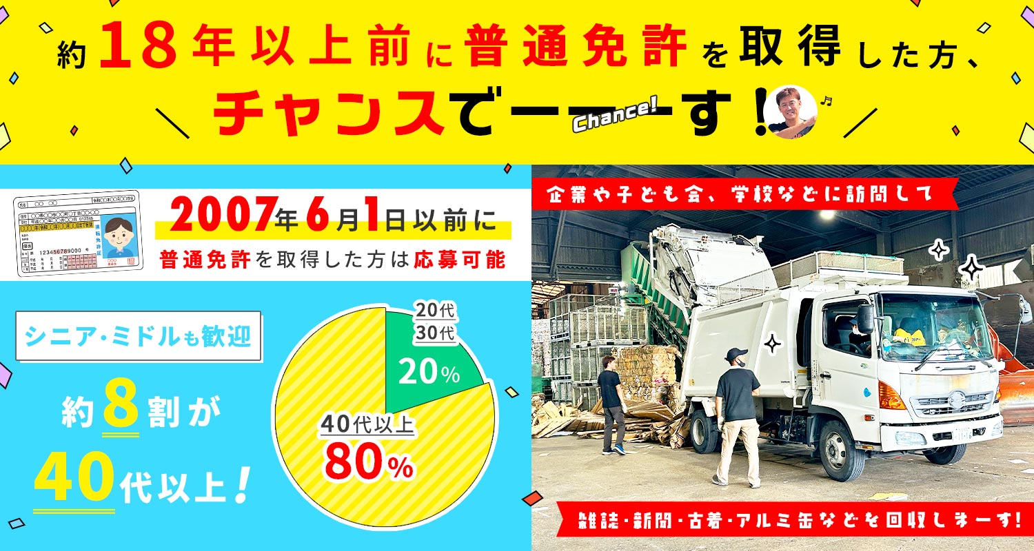 | 応募資格 | 普通自動車免許をお持ちの方(AT限定不可) ※平成19年(2007年)6月2日以降の免許取得者は、入社後に中型自動車免許を取得していただきます!(資格取得支援制度あり) ※ドライバー未経験もOK ※ブランクOK ※シニアやミドルも歓迎 |