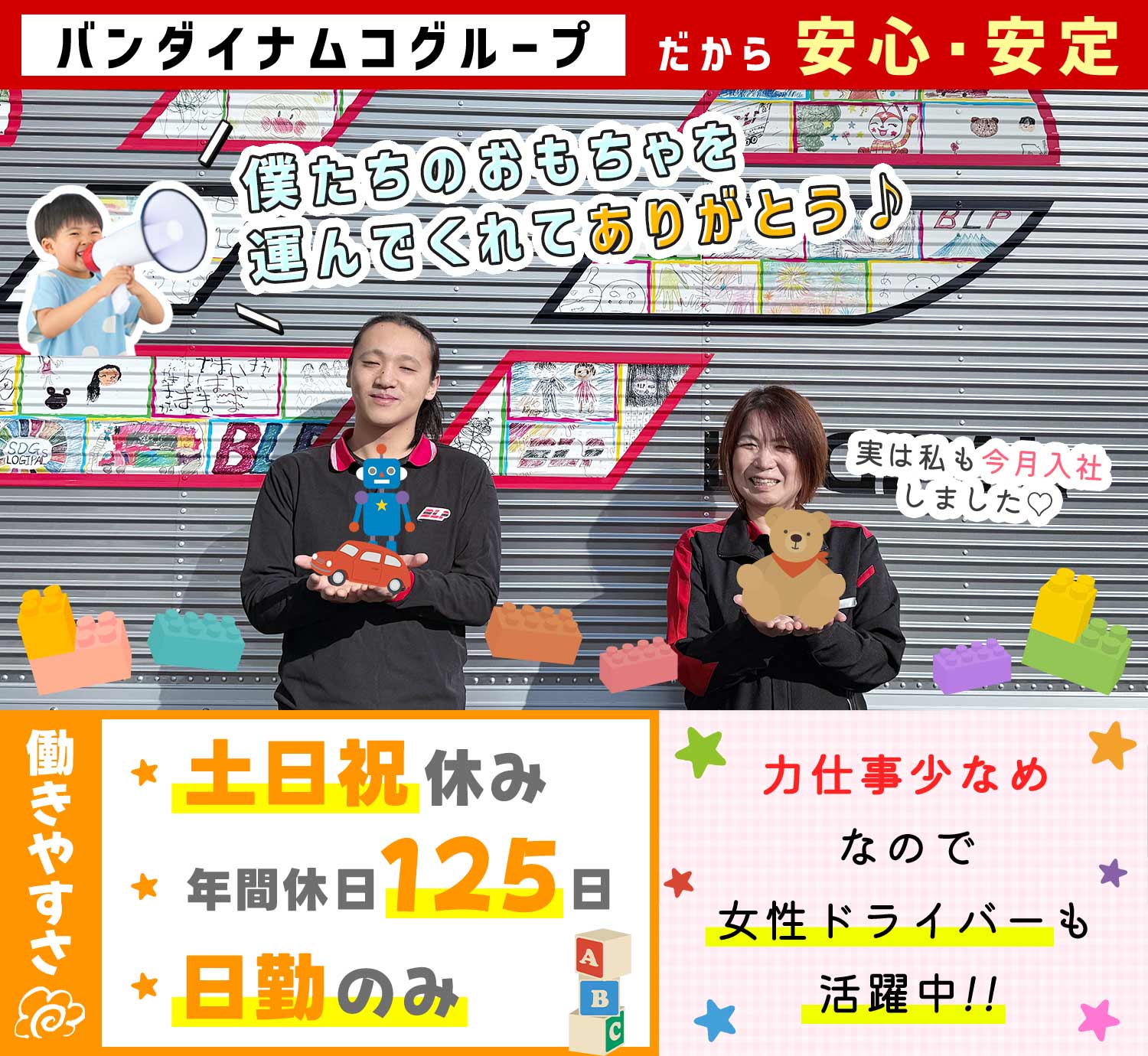 | 仕事内容 | 大型ドライバー[契] 10トントラックで、ぬいぐるみや玩具などの配送業務。 ※配送先は大阪府内(センター等・基本1~2ヶ所程度) ◆手積み・手降ろしはありますが負担は比較的少なめ 箱は大きくても中身は軽いものが多く、台車やパワーゲートを使って運ぶため、男女問わずご活躍いただけます!(女性ドライバーも活躍中) ◆17名のドライバーが活躍中 10~20代:5名、30~40代:11名、50代:3名 各世代バランス良く揃っており、馴染みやすい雰囲気の職場です◎ 働きやすく定着率もバツグン! |