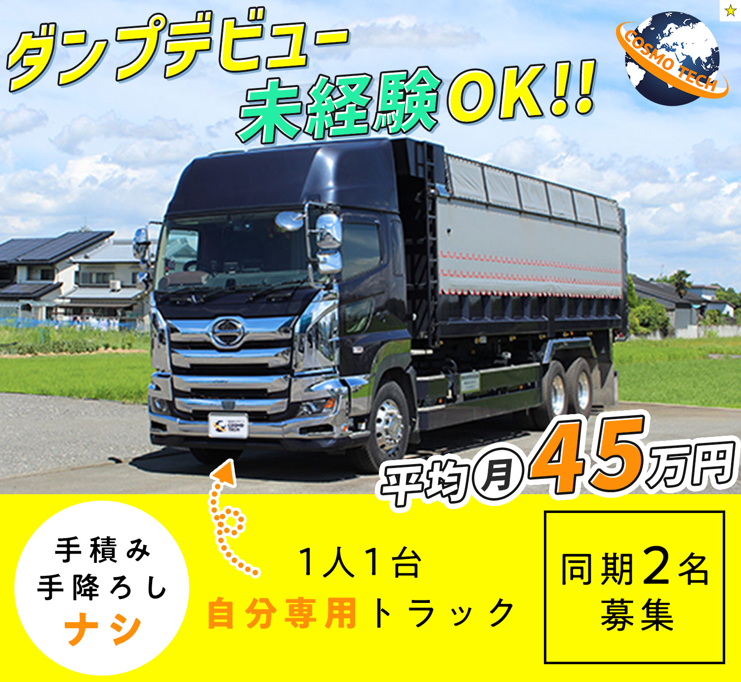 | 応募資格 | 要大型免許 大型ドライバーの経験 ※ダンプ未経験大歓迎 ※職歴・学歴不問 ※年齢不問!ミドルも歓迎 |