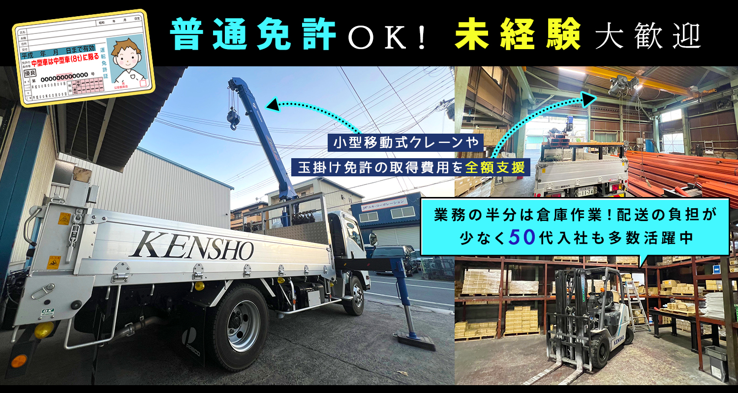 | 応募資格 | 普通自動車免許でOK ※平成19年(2007年)6月1日以前に普通免許を取得した方 ※平成19年(2007年)6月2日以降に普通免許を取得した方は中型免許が必要ですが、免許の取得支援がありますので一度ご相談ください!(給与変動あり、規定あり) ※ドライバー経験不問 ※軽作業や事務等から転職OK ※以下の免許をお持ちの方は優遇 ・小型移動式クレーン免許(5t未満) ・玉掛け免許 ・フォークリフト免許 (無い方は取得支援あり) |