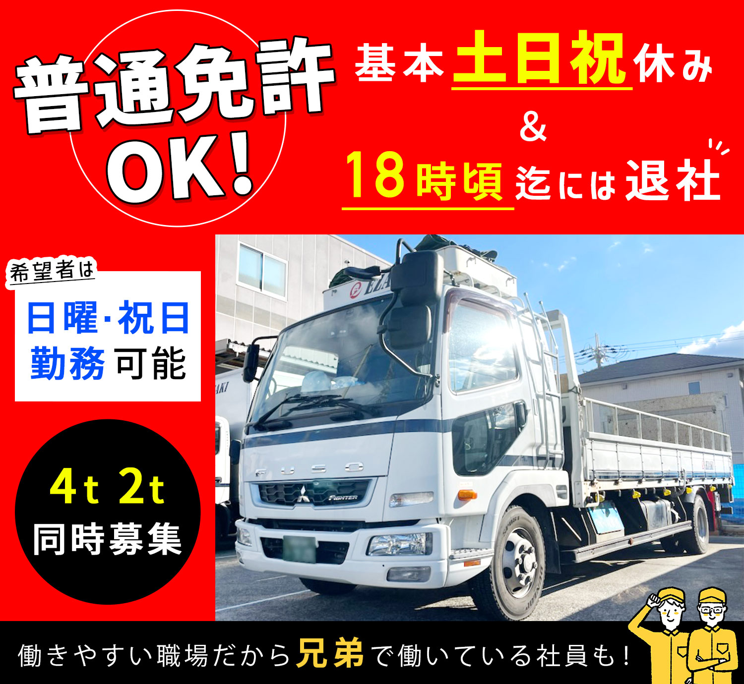 | 待 遇 | ミニボーナスあり※業績により支給(2025年支給実績あり) #昇給あり 社会保険完備 交通費規定支給 #車通勤OK (無料駐車場完備) バイク・自転車通勤OK 長距離手当(3000円) 休日出勤手当 残業手当 免許取得支援制度 (準中型・中型・大型免許の取得費用全額補助) 制服貸与 |