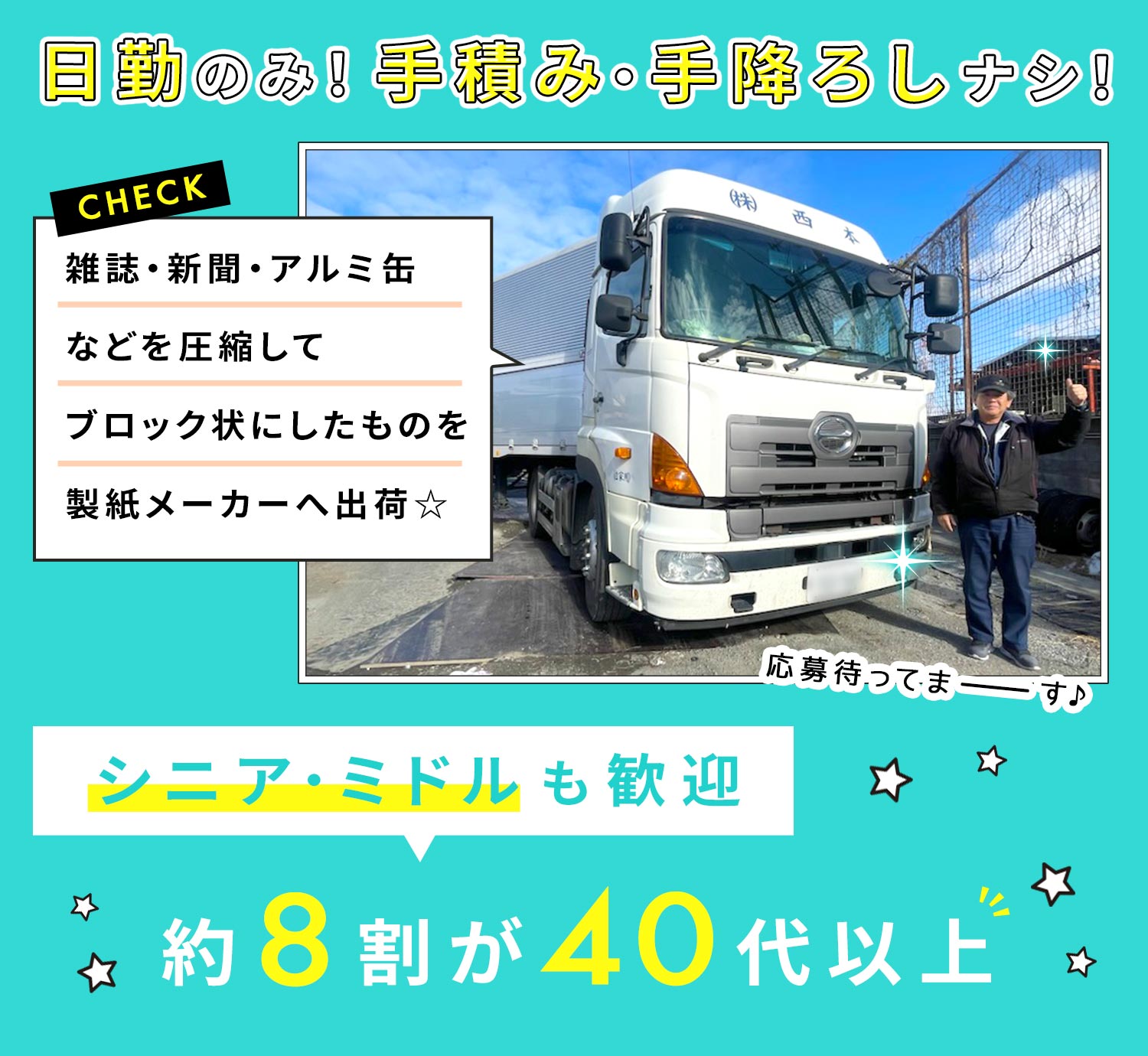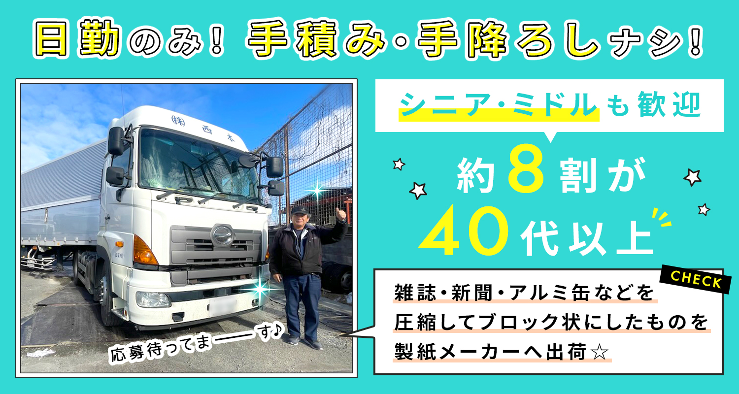| 仕事内容 | トレーラー/ドライバー[社] 雑誌・新聞などの古紙やアルミ缶などを圧縮してブロック状にした物の出荷業務。 リサイクルのために製紙メーカーの工場へ運びます。 ※手積み・手降ろしなし ■エリア:関西一円 大阪…安治川口など 兵庫…尼崎、六甲など 滋賀…大津など ※件数:1日平均3件(コースにより異なる) <一人で黙々と頑張れるお仕事> 自分のペースで運転できるため気が楽だと従業員にも好評です◎ <運ぶものは比較的汚くありません> 古紙や段ボールがメインのため、重量物はナシ。 体ににおいが付くことは少ないので作業後も安心して出かけられます◎ |