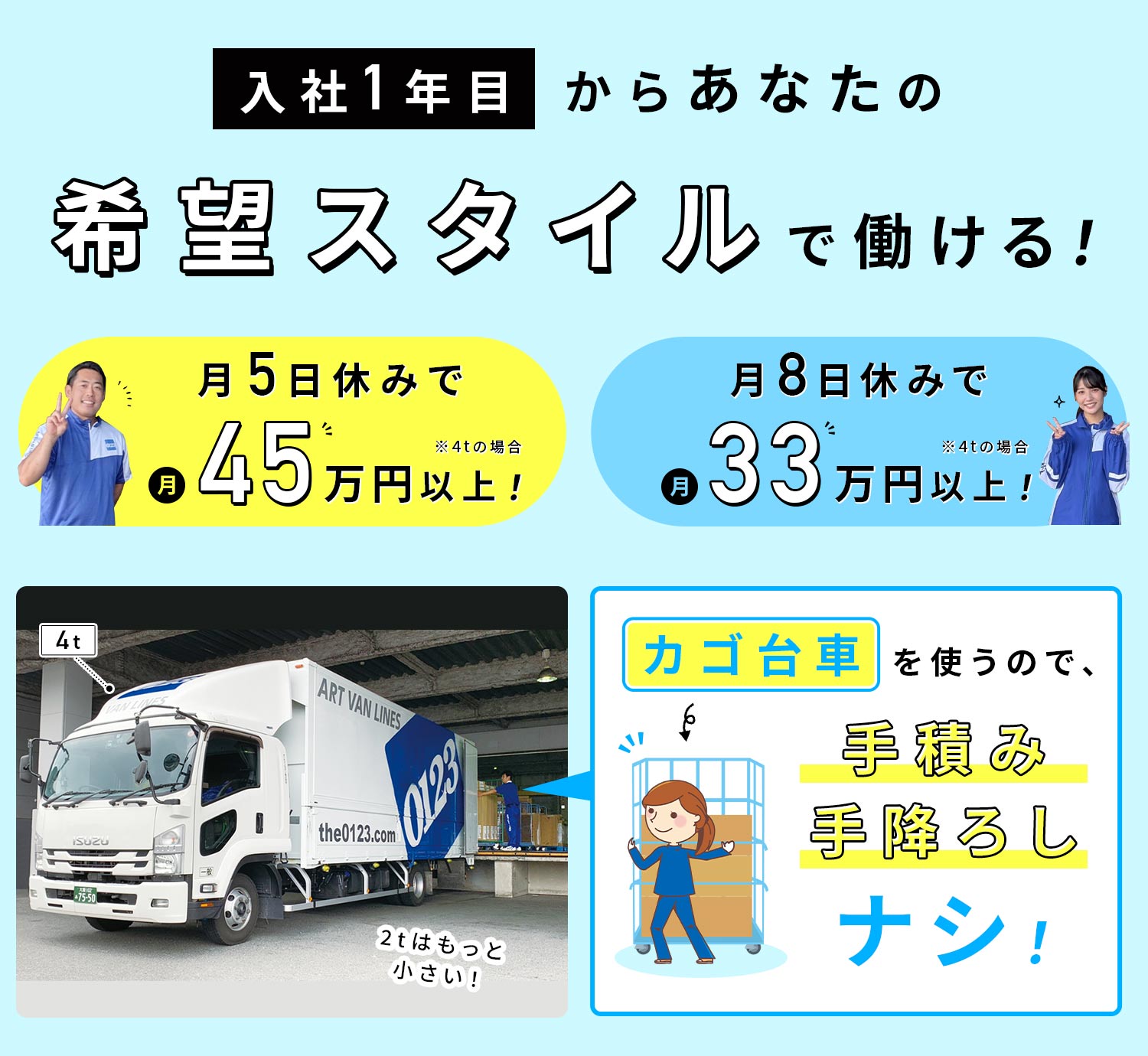 | 給 与 | (1)月給33万円~46万8000円以上 (2)月給31万7000円~37万7000円以上 ※別途、業績給(売上に応じた割増賃金)・家族手当・無事故手当等あり ◆月24日稼働で、(1)月収42万円以上(2)月収34万円以上のドライバーも!(働き方は相談OK) ◆1年目の想定年収600万円! ※試用期間3~12ヶ月(平均3ヶ月)/期間中は契約社員(賞与なし・それ以外は正社員と同条件) ※期間中も【平均月収25~30万円】と安定! |
