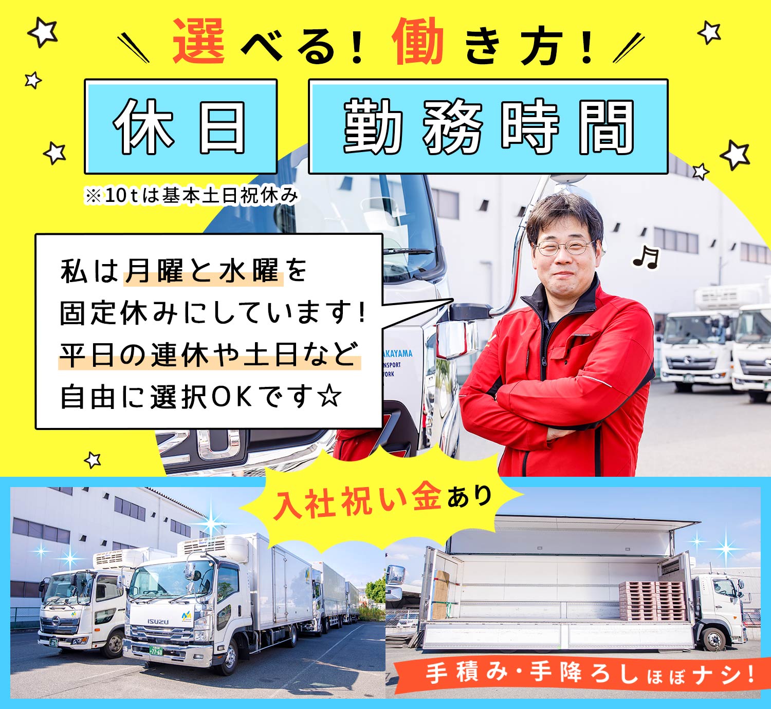 | 仕事内容 | ドライバー/軽作業や事務等からも転職OK[社] 4tトラックで食品・飲料・雑貨などの商品を量販店やスーパー等へ配送いただきます。 ※エリア:大阪府内中心の関西エリア(近・中距離配送のみ) ※手積み・手降ろしほぼなし(パレットや台車を使用) |