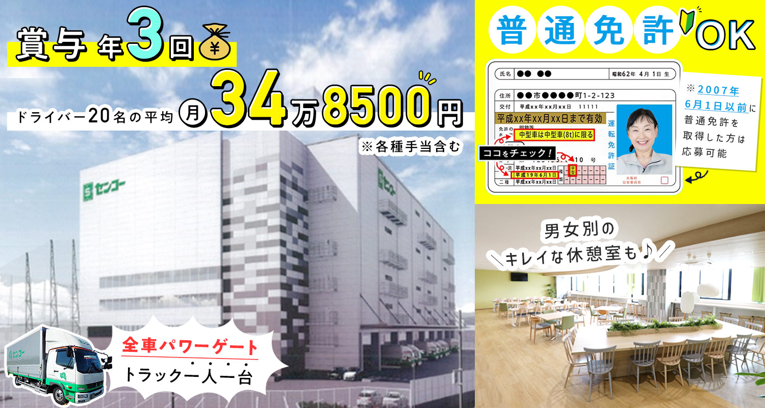 | 応募資格 | 要普通自動車免許 ※平成19年(2007年)6月2日以降に普通免許取得の方は要中型免許 ※ドライバー未経験の方、異業種からの転職も歓迎 ※男女歓迎、学歴不問 |