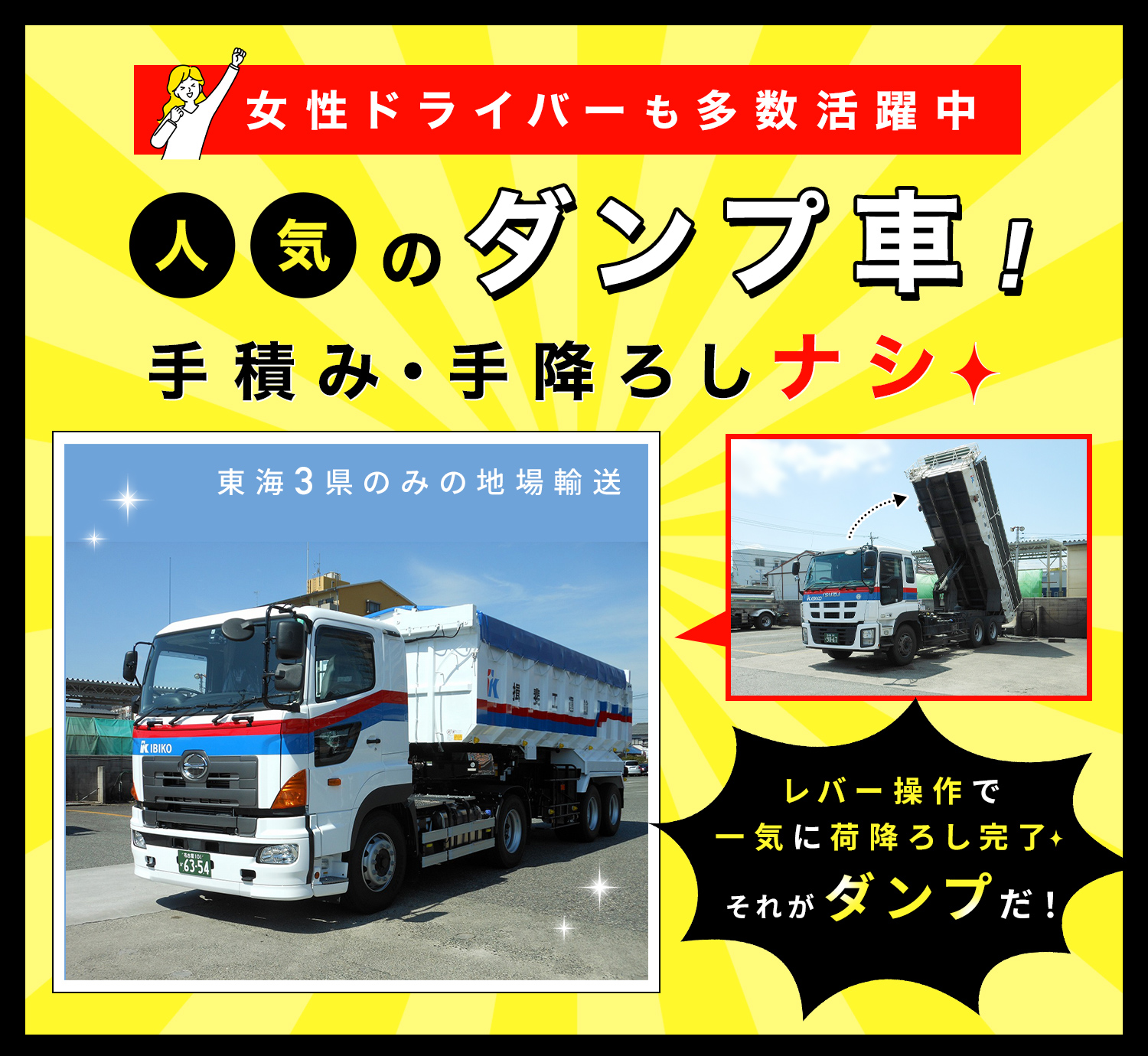 | 仕事内容 | 大型ドライバー/ダンプ[社] ダンプ車を運転し、主に石炭など原燃料や、灰などのリサイクル原料の輸送をお願いします。 ■輸送先は、東海3県内の近距離中心(セメント会社、処分場など) <コース例> 碧南市~半田市 ×3往復 碧南市~岐阜県本巣市または三重県伊賀市 ×2往復 碧南市のお客様工場内で、横持ち輸送 など。ほぼ固定ルートなので、道を覚えると簡単! ■体力的な負担は少なめ!当社では、女性のダンプドライバーも6名活躍中! 積み込みはお客様先の作業員が担当。降ろしも、レバーを操作するだけ! ■横乗り研修完備(1人立ちまで責任を持ってサポート。最大3ヶ月で、期間は個々の能力に合わせて短縮・延長など柔軟に対応) |