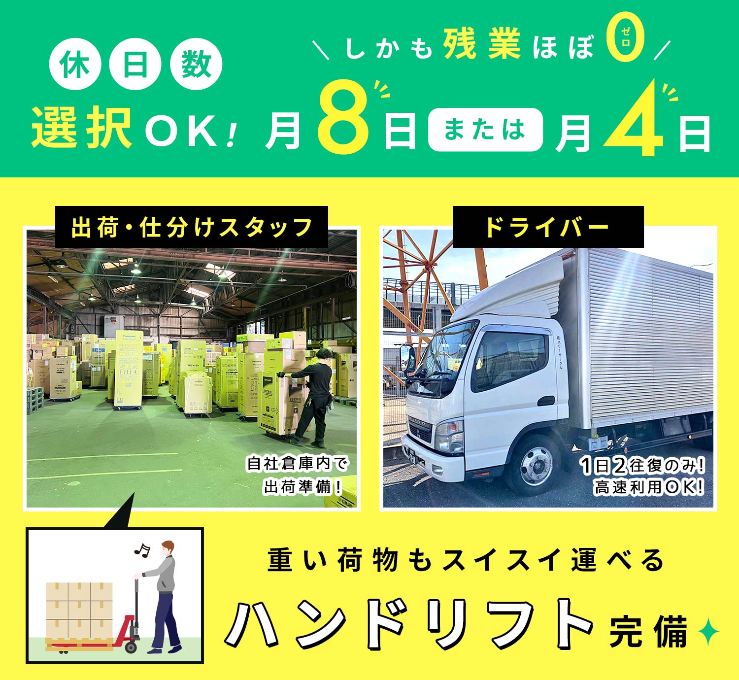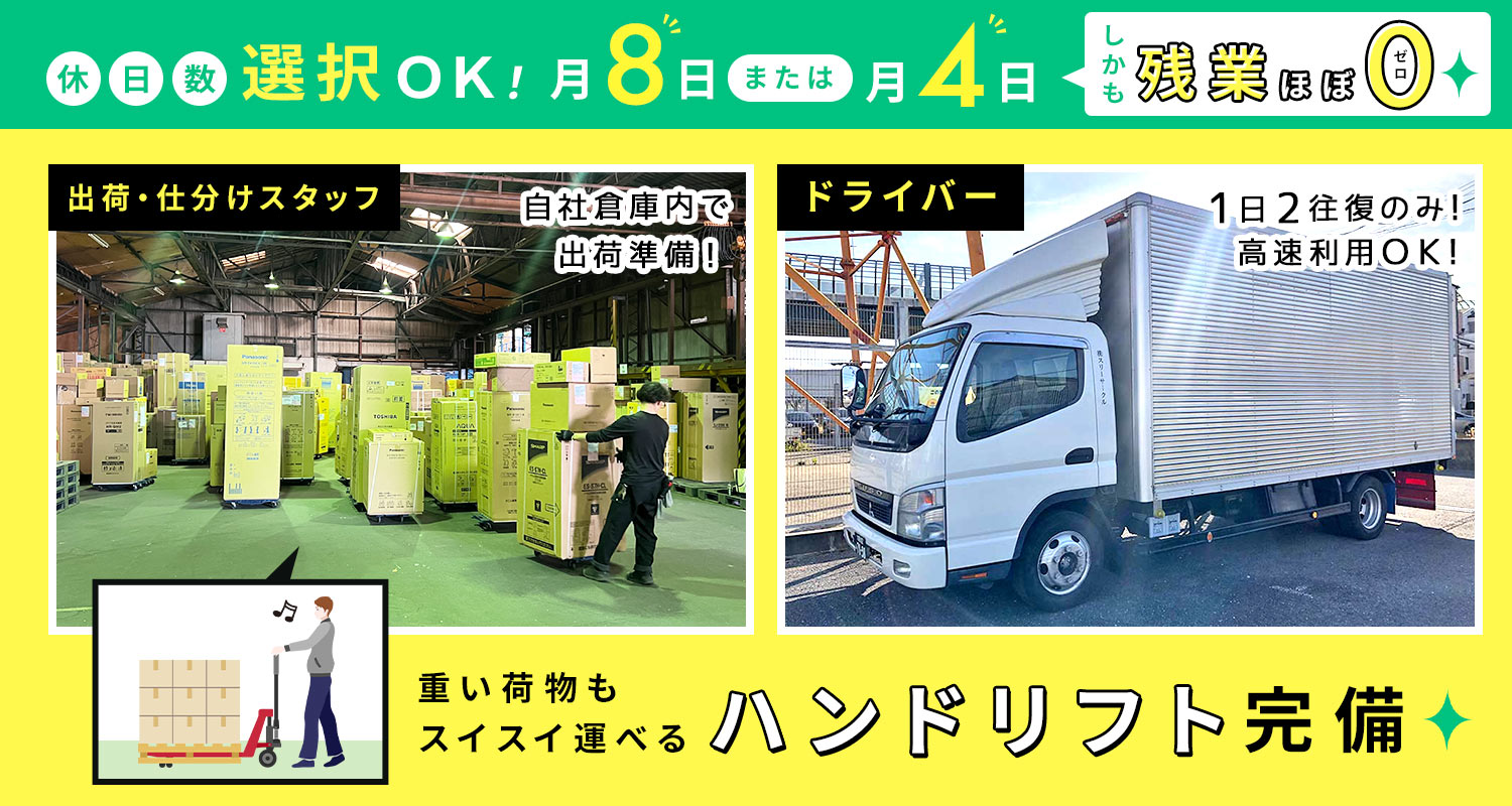 | 仕事内容 | 仕分け・出荷スタッフ/軽作業[社] 自社倉庫内で、荷物(主に家電製品)の仕分け、出荷準備等をお願いします。 ◆具体的には ・ドライバーが運んでくる荷物を、トラックから降ろす(台車&パワーゲートで楽々!) ・荷物に貼っている伝票を確認 ・いつ、どこに運ぶかを確認し、配送コースごとに仕分ける など ◆『ハンドリフト』使用で重い荷物を運搬! 手作業だけでは重くて運べない荷物を持ち上げ、身体への負担を軽減しながら運搬できます! |