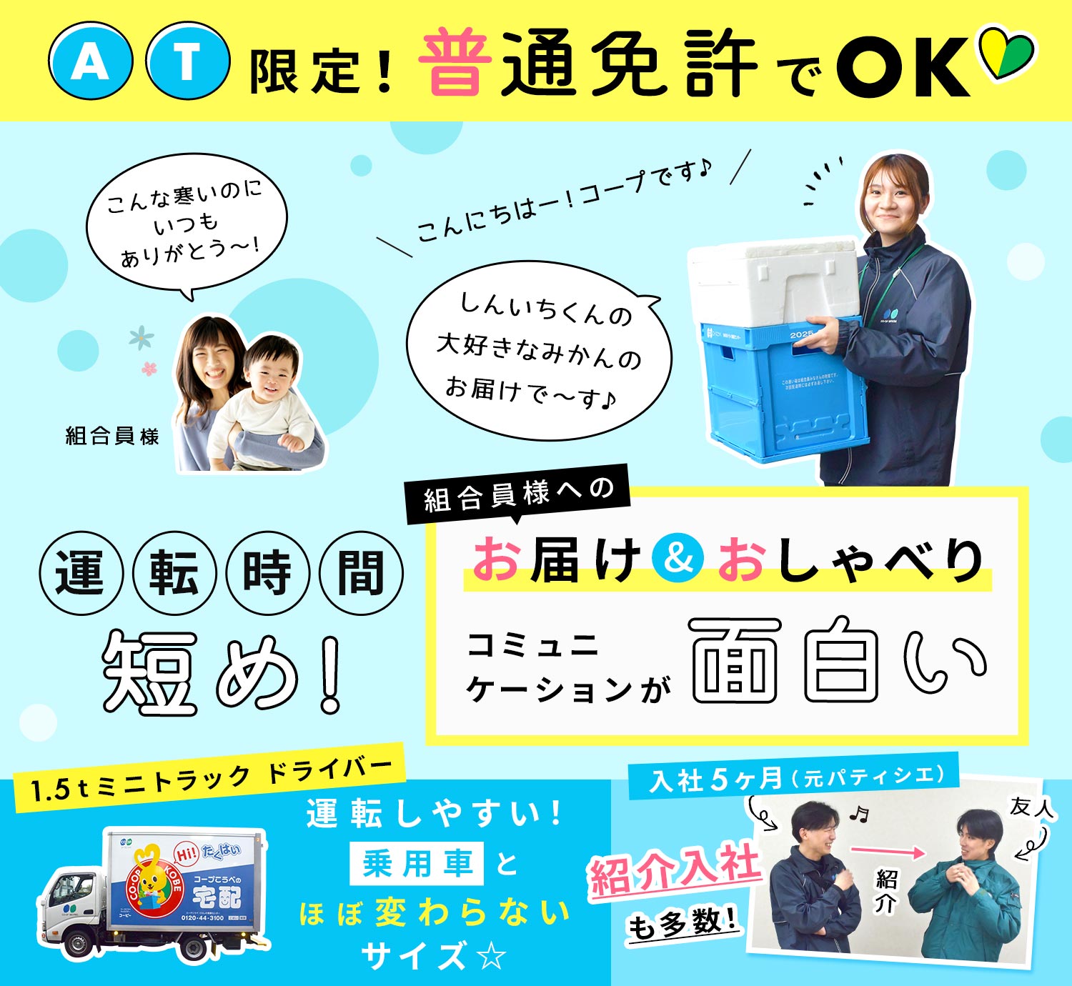 | 職 種 | 男女ミニトラックドライバー/普通免許(AT)OK <組合員様 専属ドライバー> |