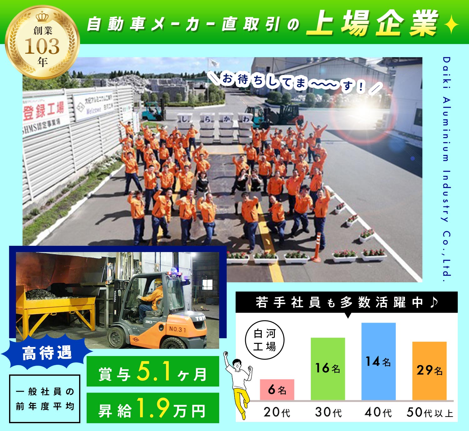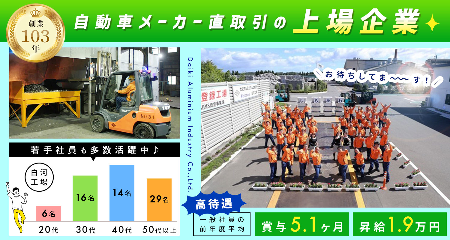 | 仕事内容 | 製造/軽作業などからも転職OK[社] 自動車部品等の製造に使用される「アルミ二次合金」の製造業務をお願いします。 <程よく身体を動かしたい方に、オススメの仕事!> ■フォークリフトを運転し、原料を大きな炉に投入 ■温度や成分を調整しながら、原料を溶かしていく作業 など なかなかイメージしづらい部分もあると思いますので、まずは面接で、お気軽に話を聞きに来てくださいね◎ <20~30代の若手や、女性スタッフも活躍中!> 白河工場では、現在65名の製造スタッフが在籍しており、20代6名、30代16名、40代14名、50代以上29名と、幅広く活躍しています。 安定した待遇と、やりがいある仕事、また無理のない勤務体系のため、勤続30年以上の社員もたくさんいるんです!年齢を重ねても、安心して続けれらる仕事ですよ! |
