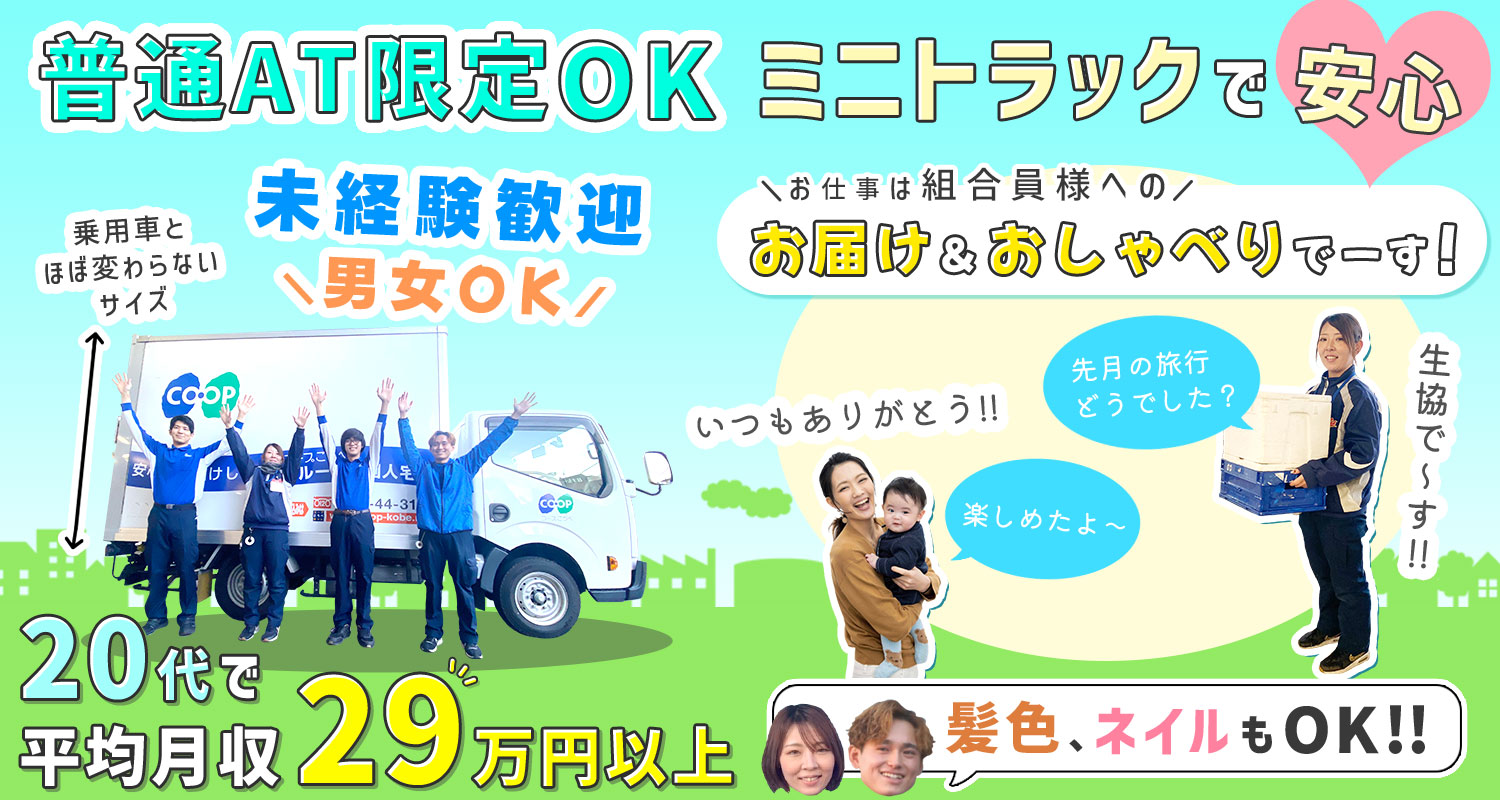 | 仕事内容 | ミニトラックドライバー/軽作業や事務等からも転職OK[社] 当社の配送ドライバーとして、コープこうべの組合員様に対する生協商品の配送をお任せします。 ※決まったコースのルート配送です。 ※再配達ナシ!! 配送件数:1日約50件(コースによって異なる) エリア:半径1Km程度の狭いエリア ※担当コースは3年毎に変更予定 □□□ <1日のスケジュール例> Aコース 07:30~ 積み込み作業 09:00~ 配送スタート(約50軒ほど) 12:30~ お昼休憩 17:00~ 配送終了後、注文書の処理 18:00~ 退勤 Bコース 07:30~ 積み込み作業 09:00~ 配送スタート(約50軒ほど) 12:30~ お昼休憩 17:00~ 配送終了後、注文書の処理 16:00~ 退勤 |