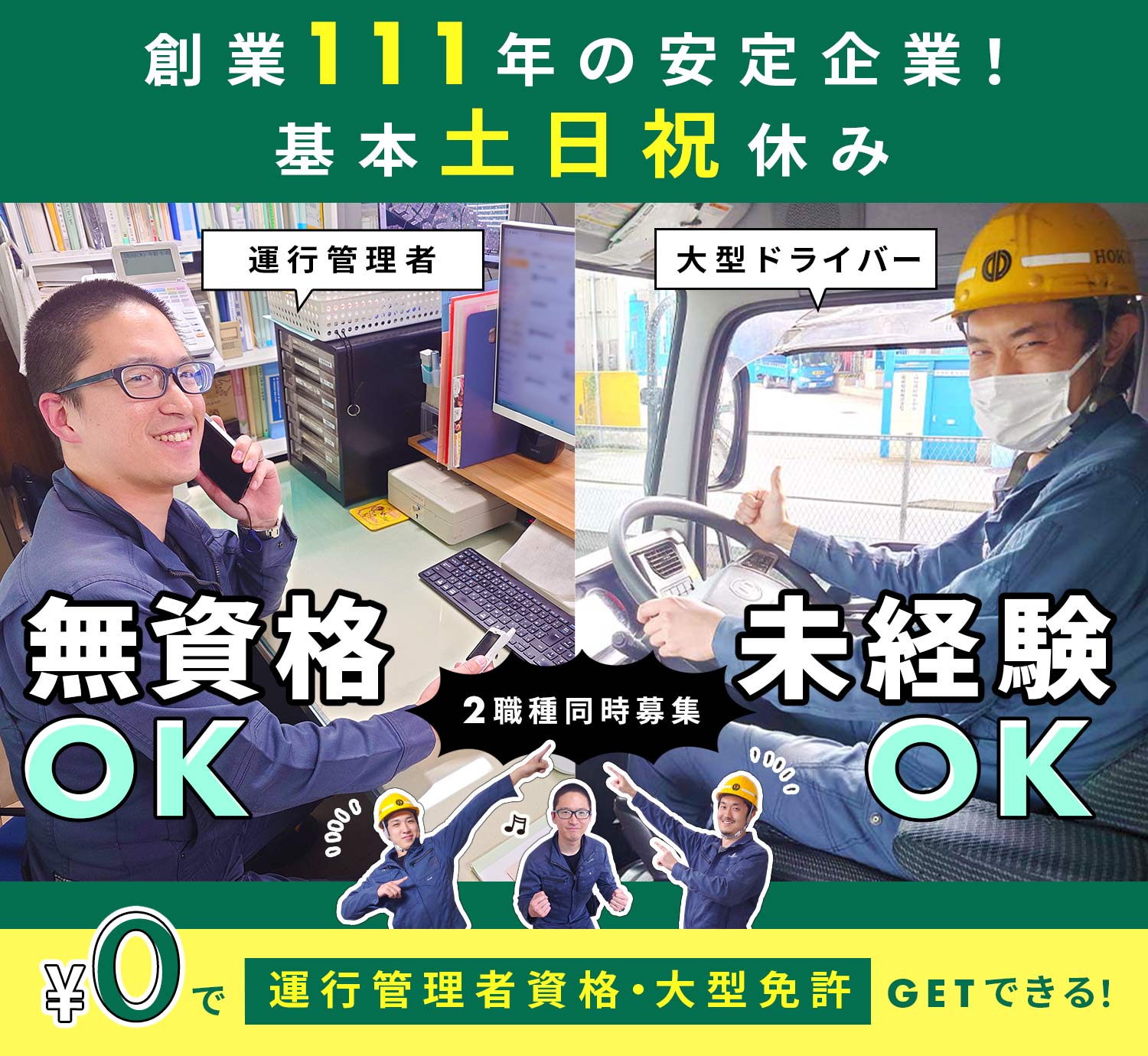 | 応募資格 | 普通免許で応募OK! ※大型免許取得支援制度あり(自己負担なし) 入社後、研修を受けてもらいながら、教習所に通っていただきます(自宅から近い所でOK) 取得までの期間は、最短で3週間~1ヶ月程度(教習所による) ※大型免許をお持ちの方は大歓迎 ※ミドルも歓迎 #ブランクOK |