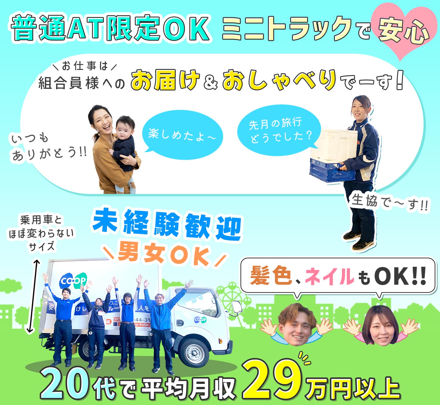| 仕事内容 | 会員専属のミニトラックドライバー/軽作業や事務等からも転職OK[社] 当社の配送ドライバーとして、コープこうべの組合員様に対する生協商品の配送をお任せします。 ※決まったコースのルート配送です。 ※再配達ナシ!! 配送件数:1日約50件(コースによって異なる) エリア:半径1Km程度の狭いエリア ※担当コースは3年毎に変更予定 □□□ <1日のスケジュール例> Aコース 07:30~ 積み込み作業 09:00~ 配送スタート(約50軒ほど) 12:30~ お昼休憩 17:00~ 配送終了後、注文書の処理 18:00~ 退勤 Bコース 07:30~ 積み込み作業 09:00~ 配送スタート(約50軒ほど) 12:30~ お昼休憩 17:00~ 配送終了後、注文書の処理 16:00~ 退勤 |