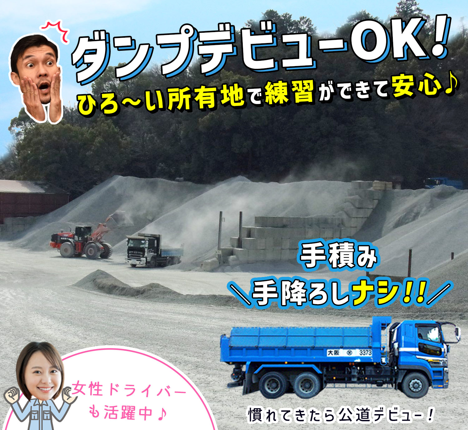 | 仕事内容 | ダンプドライバー[社] 建築現場で使用される砕石・土砂の運搬業務。 ※配送先は大阪府下メイン ※手積み・手降ろしなし ※一人一台の専用ダンプあり ※高速代を含め、業務を行う上での自己負担は一切ありません! ※自社に整備士が在籍しており、安心して業務に取り組めます! □□□ ※サイト内で『土日祝休みのダンプドライバー[社]』の募集広告あり! |