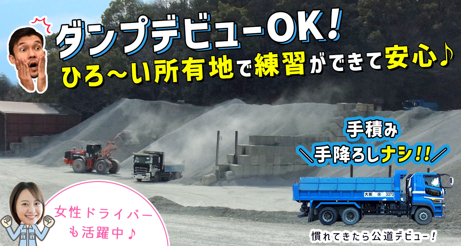 | 仕事内容 | ダンプドライバー/土日祝休み[社] 建築現場で使用される砕石・土砂の運搬業務。 ※配送先は大阪府下メイン ※手積み・手降ろしなし ※一人一台の専用ダンプあり ※高速代を含め、業務を行う上での自己負担は一切ありません! ※自社に整備士が在籍しており、安心して業務に取り組めます! |