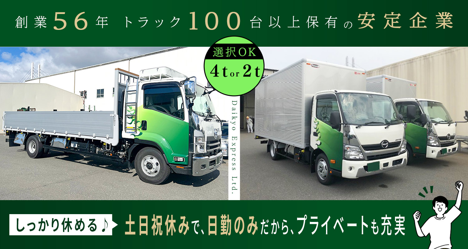 | 仕事内容 | ドライバー[社] 4tトラックを運転し、建材製品のルート配送をお願いします。 ★地場配送のみ! 西淀川の営業所を出発し、大東市で荷積みを行います。 その後、京都や姫路方面などの関西圏の建設現場や建材屋へ配送します。 ★配送件数は少なめ! 距離によりますが、少ない日で1日2件程度、多くて1日6・7件程度です。 ★荷積み、荷降ろしは、フォークリフトを使用。一部、手積み・手おろしもありあります。 □□□ 【経験に応じた研修あり】 まずは先輩のトラックの助手席に乗り、仕事の流れや運転のコツなどを学びます◎ 次に荷物が乗っていない空車のトラックをあなたが運転し、先輩が横乗り。そして最後に、荷物を載せた状態であなたが運転し、先輩が横乗りして、晴れてデビュー!経験・能力により研修期間は短縮しますが、未経験の方でも手厚く「最長3か月」じっ~くり研修しますので、安心してお越し下さい◎ 【敷地内でトラックの見学、乗車OK】 運転はできませんが、運転席からの眺め、雰囲気等をぜひ掴んでください◎ |