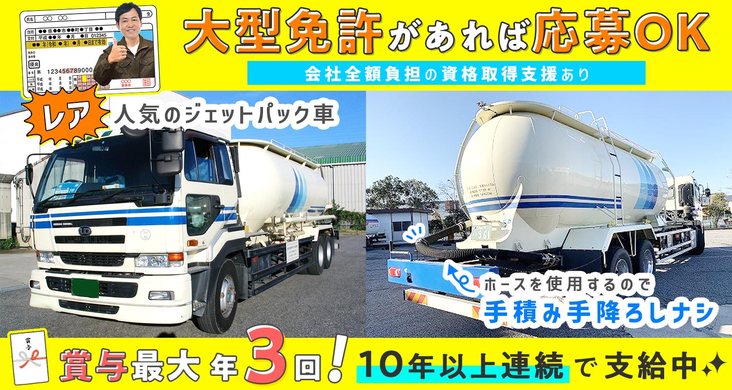 | 仕事内容 | 大型ドライバー/ジェットパック[社] ジェットパック車を運転し、粉粒体の地場輸送をお願いします。 ■近距離拠点間の往復のみ! ◎碧南市内の2拠点または武豊町の1拠点への輸送 ◎1日5~7往復で、走行距離1日100kmほど ◎輸送先は決まっており、走行するのは広い道路ばかりです! ■手積み・手降ろし一切ナシ ■横乗り研修完備(1人立ちまで責任を持ってサポート。最大3ヶ月で、期間は個々の能力に合わせて短縮・延長など柔軟に対応)  |