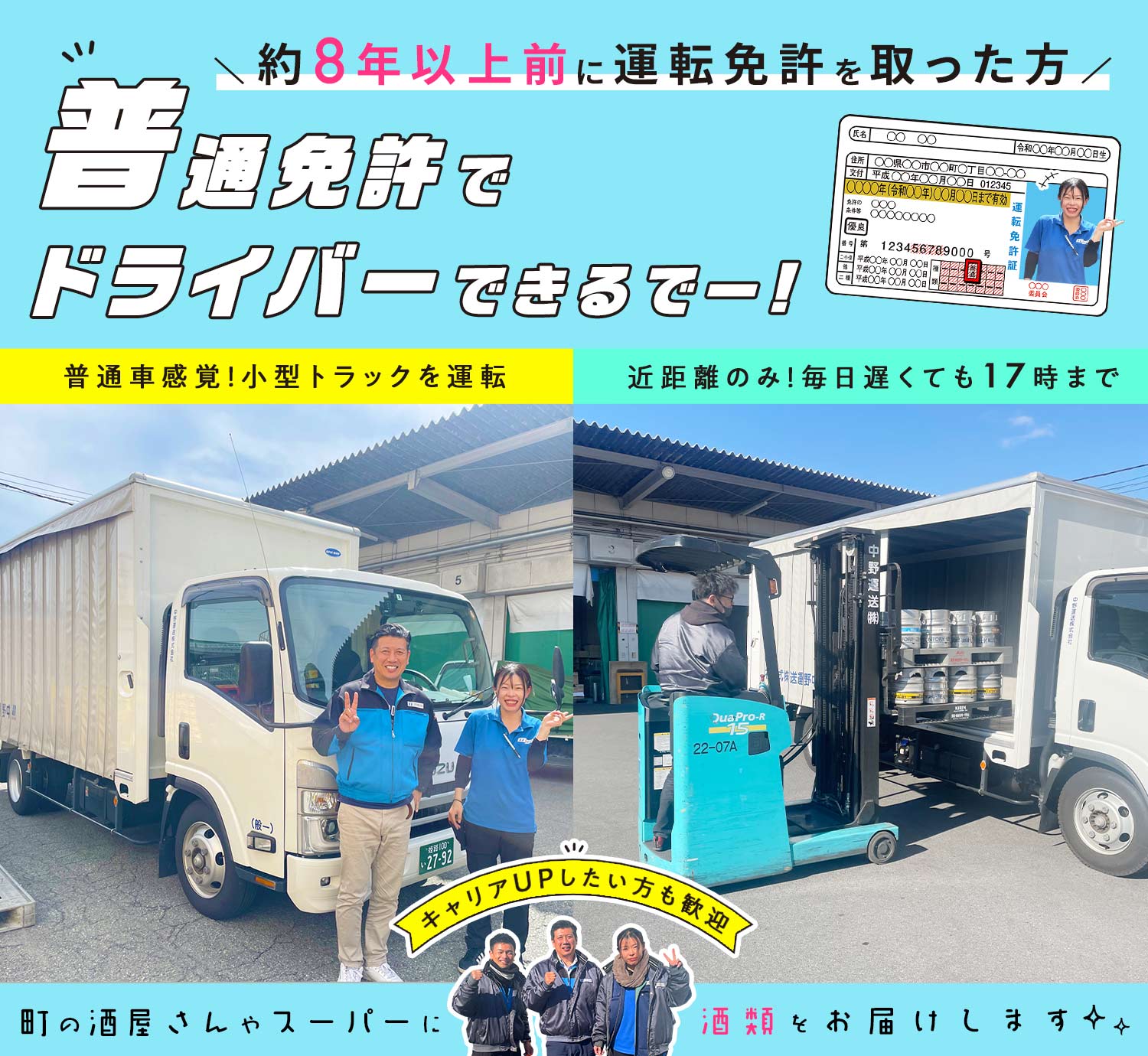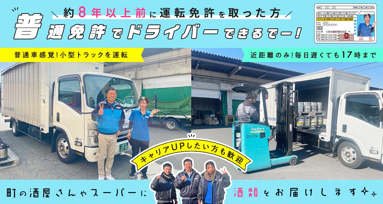 | 待 遇 | #賞与あり 年2回 #昇給あり 年1回 #昇格あり 社会保険完備 #車通勤OK (駐車場無料) バイク通勤OK 資格取得支援あり (リフト免許、費用全額支給) 制服貸与 休憩所あり 個別ロッカーあり 社割販売 (ビール・調味料など) プロバスケットボールチーム「大阪エヴェッサオフィシャルスポンサー」※観戦無料 研修制度あり ※入社後1週間~10日は横乗り研修にて、ルートを覚えたり、積み方や伝票の書き方など丁寧にお教えします。 |