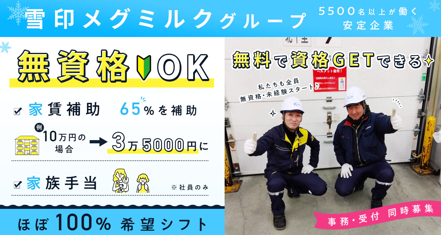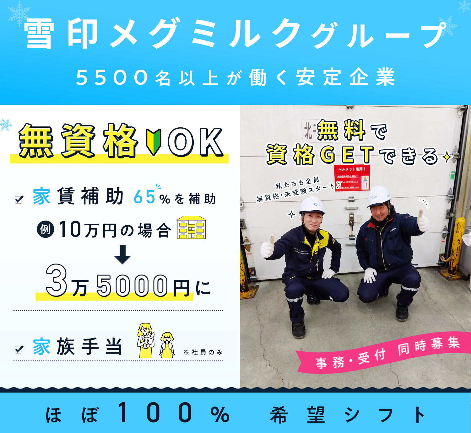 | 仕事内容 | 倉庫作業・フォークリフト/軽作業などからも転職OK[社] 冷蔵庫内または構内でのフォークリフトによる運搬作業やトラックへの荷積み・荷下ろしなどをお願いします。 ■馴染みある商品を取り扱います 雪印メグミルクの牛乳、ジュース、ヨーグルトやデザートなどよく知った商品を取り扱っていただきます。 ■主に冷蔵倉庫内での作業 倉庫内は品質維持のために7℃以下に保たれていますが、防寒着を貸与しますので、快適に働いていただけます。 <倉庫作業の流れ> 1. 入庫作業 外部から運ばれてきた商品をフォークリフトで下ろして、端末機でバーコードを読み取り入庫作業します。 2. 仕分け作業 出荷指示に合わせて商品を集品します。 3. 出荷作業 出荷指示書を確認して、トラックに積み込みます。 あなたの手で多くの人に安全でおいしい商品を送り出してください。 |