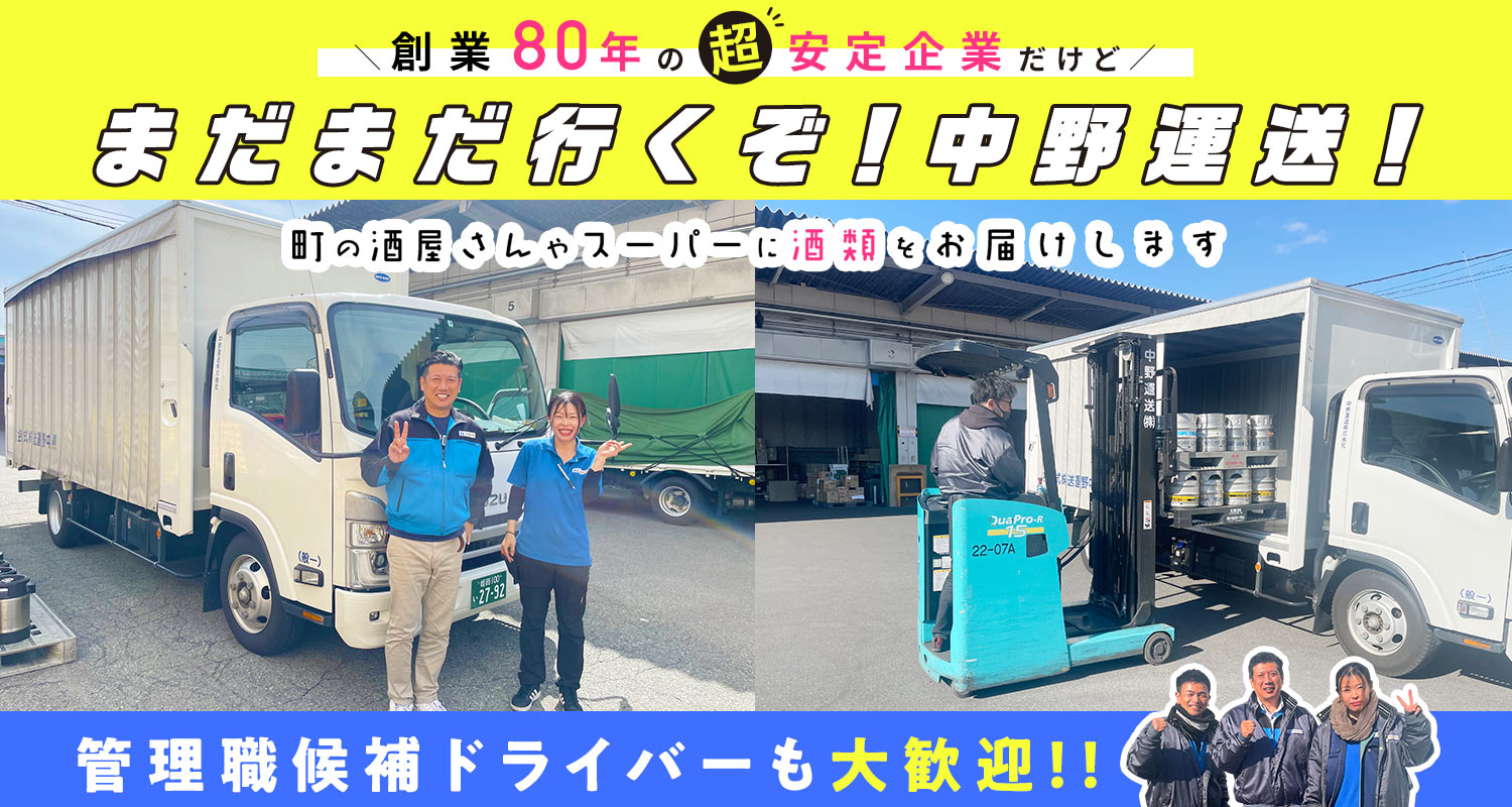 | 待 遇 | #賞与あり 年2回 #昇給あり 年1回 #昇格あり 社会保険完備 #車通勤OK (駐車場無料) バイク通勤OK 資格取得支援あり (リフト免許、費用全額支給) 制服貸与 休憩所あり 個別ロッカーあり 社割販売 (ビール・調味料など) プロバスケットボールチーム「大阪エヴェッサオフィシャルスポンサー」※観戦無料 研修制度あり ※入社後1週間~10日は横乗り研修にて、ルートを覚えたり、積み方や伝票の書き方など丁寧にお教えします。 |