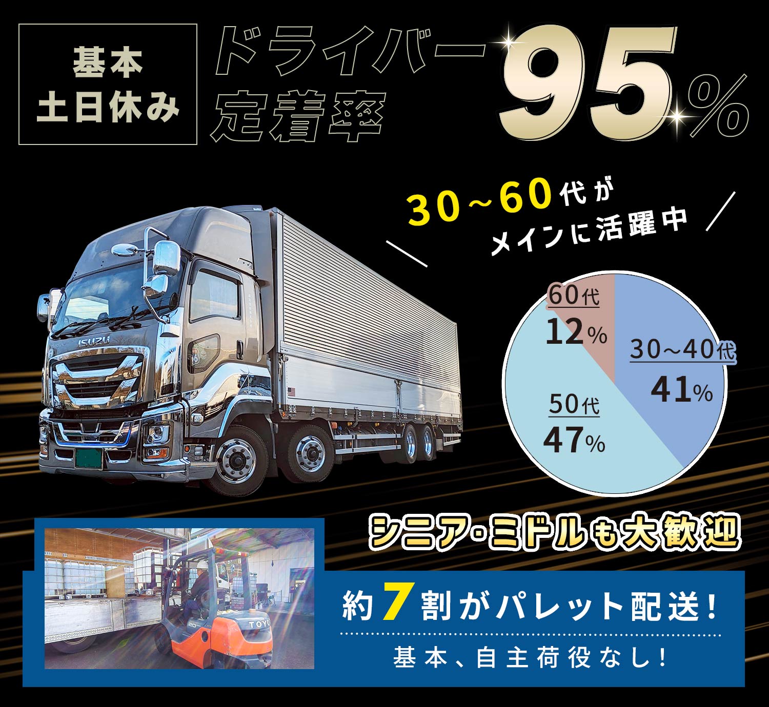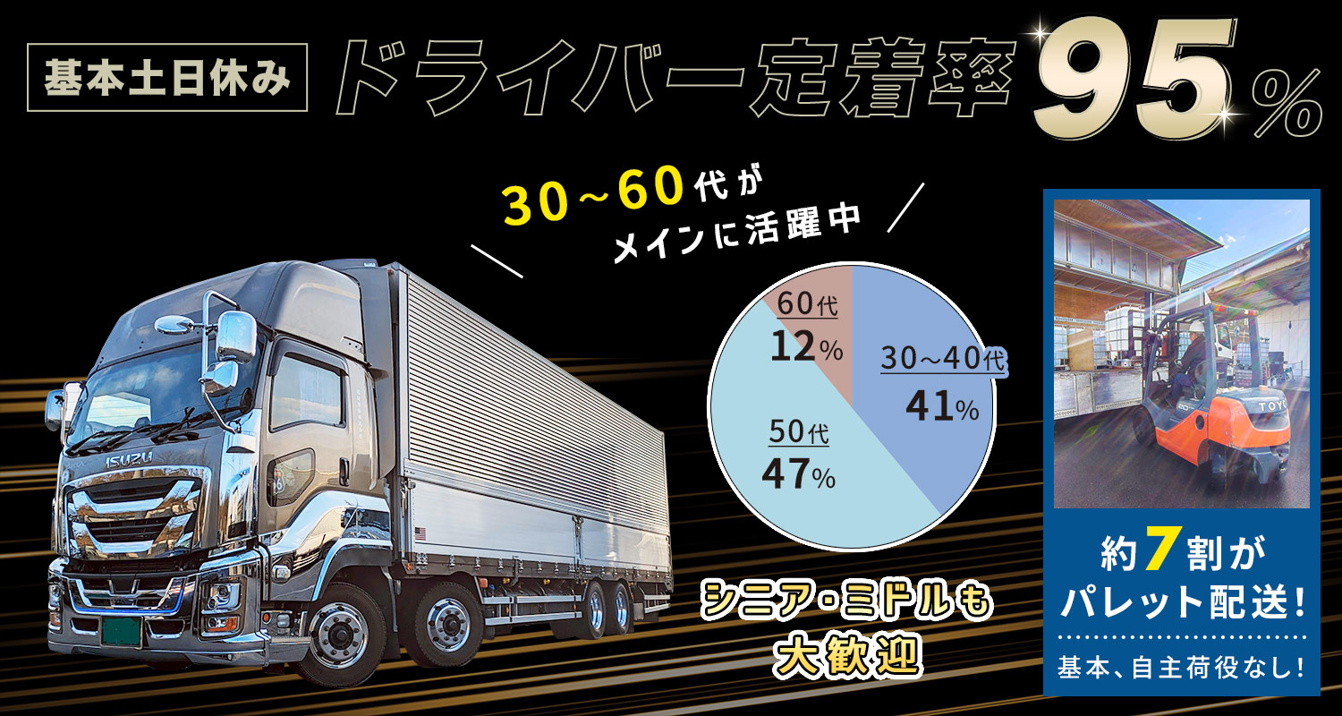 | 待 遇 | #賞与あり 年2回(業績による) #昇給あり 社会保険完備 #車通勤OK (無料駐車場完備) バイク・自転車通勤OK 資格取得支援制度(入社6カ月で4tから大型へキャリアアップ実績あり) トラック一人一台支給 バックモニター・ドライブレコーダー完備 定期メンテナンス実施 <<充実した研修制度あり>> 先輩が横に乗って効率の良い運行ルートや客先対応など 一つひとつ丁寧にレクチャーしていきます。 |