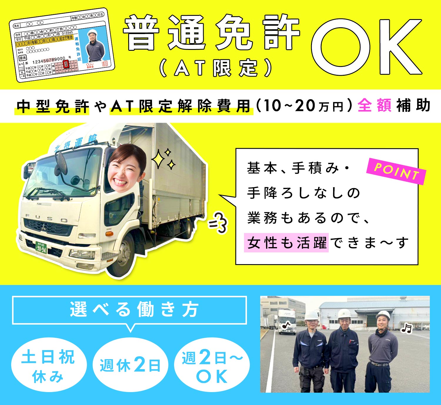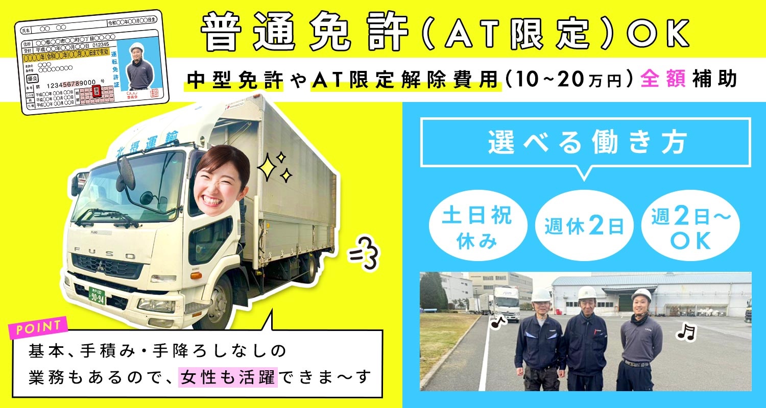 | 応募資格 | 普通自動車免許でOK ※2007年(平成19年)6月1日以前に普通免許取得の方 ※2007年(平成19年)6月2日以降に普通免許取得された方は、要中型自動車免許 ※ドライバー未経験大歓迎 ※軽作業や事務等から転職OK ※学歴不問 #ブランクOK #扶養内勤務OK |