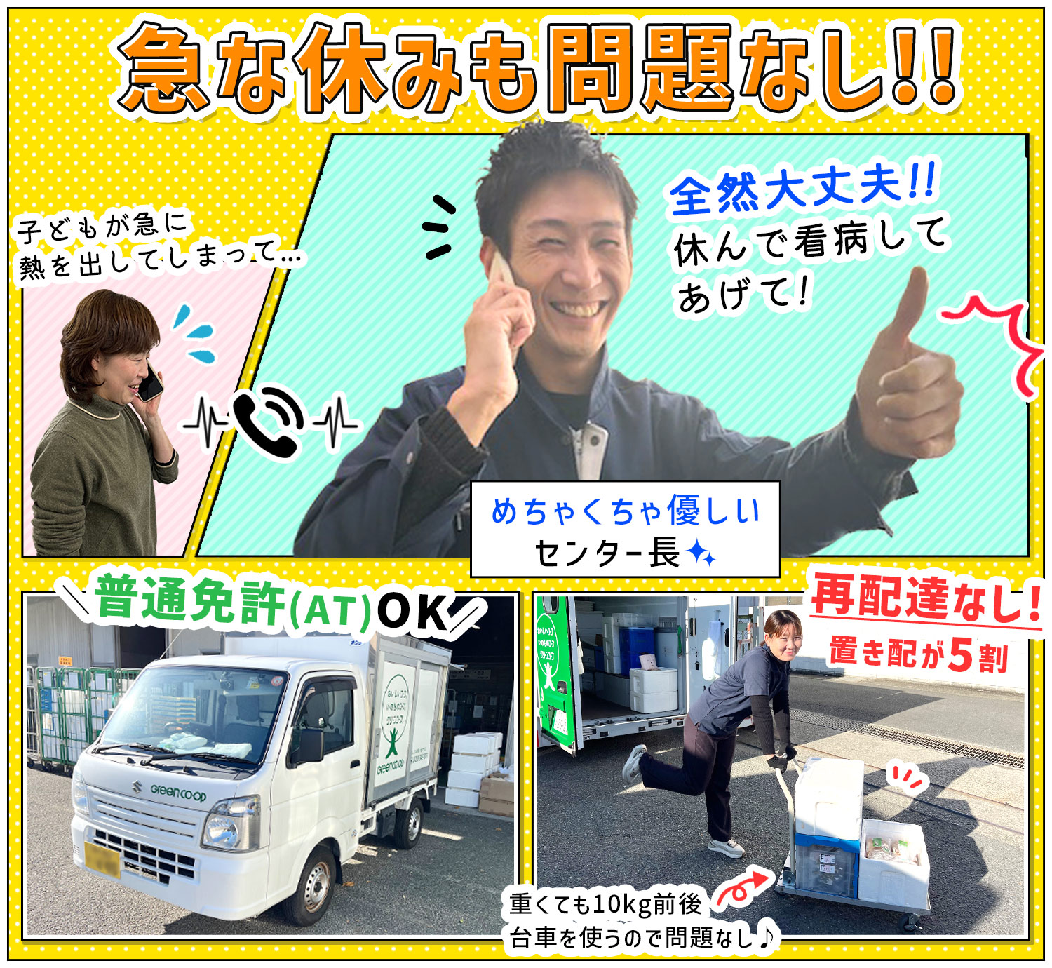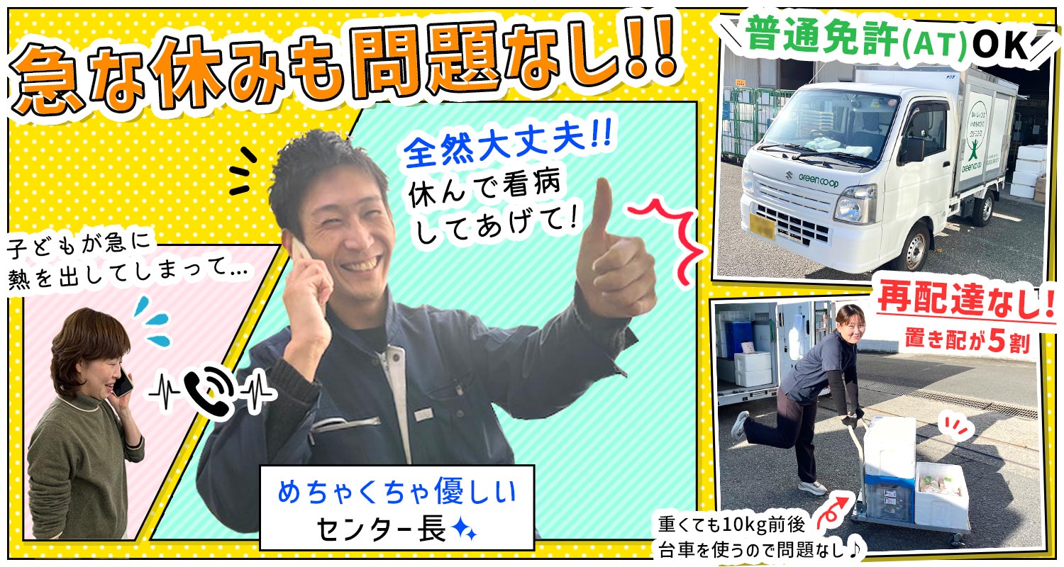 | 仕事内容 | ミニ電気トラック(AT限定OK)のドライバー/シニアやミドルも歓迎[契] 「グリーンコープ生活協同組合ひょうご」のドライバーとして、組合員さん宅へ商品の配送をお願いします。 ※5割が置き配で、再配達なし ※ノルマなし ※曜日ごとの固定ルートなので覚えやすい!5つのルートのみ覚えればOK! ※国産品や産地直結にこだわった食品や、環境に配慮した日用品をお届けします。 ◎車種…1トンの電気トラック(普通免許オートマ限定OK) ◎配送エリア…伊丹市・西宮市・芦屋市・神戸市 他(1日のうち、ひとつの市のみ) ◎運ぶもの…食品・日用品など。注文商品が多い際は台車も使用しています。 ※研修制度あり 1~2ヵ月の研修で、配送ルートや業務手順など、一つひとつ丁寧にレクチャーします。 対面でのお渡しの際には「この間のお野菜おいしかったわ~」などのうれしいお言葉をいただくことも! 組合員さんの満足度が高く、「いつも届けてくれてありがとう」と感謝されることも多いんです◎ |