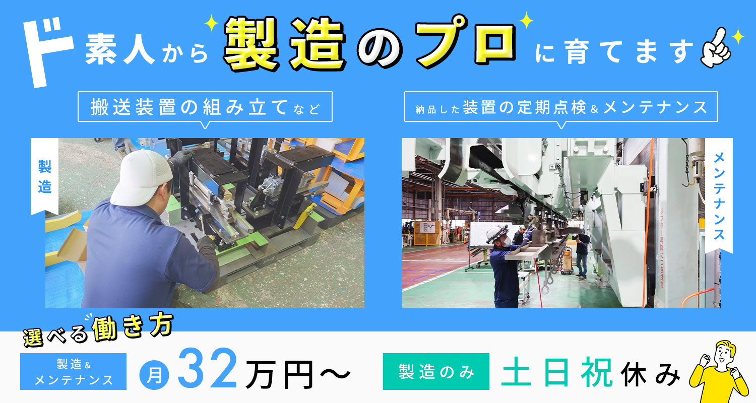 | 仕事内容 | 製造/軽作業等からも転職OK[社] プラント・工場などで使われる搬送装置(製造や塗装・梱包などのラインのコンベア、他)の製造業務をお願いします。 ◆主に塗装と組立を担当 製缶作業などの後に専門ブースにて塗装を実施。 吹き付け塗装が基本で、用途に合わせて焼付塗装を行うこともあります。 そして塗装が完了後、組み立てて完成品にします。 ミリ単位で調整し、最終的な製品チェックも踏まえた工程です。 ◆ステップアップも可能 上記業務の他にも機械設計や現場据え付け工事、電気工事・電気制御など様々な工程がありますので、得意な分野に特化したスペシャリストを目指すのもいいですし、全てを学び、幅広く活躍するオールラウンダーを目指すのももちろんOK! 意欲ある方には電気工事士などの資格取得もバックアップしています。 ◆大手企業との取引多数 これまでの実績と信頼から、名立たる企業との取引実績があります。 スケールの大きな仕事をオーダーメイドで任せてもらえる面白さを味わえますよ! |