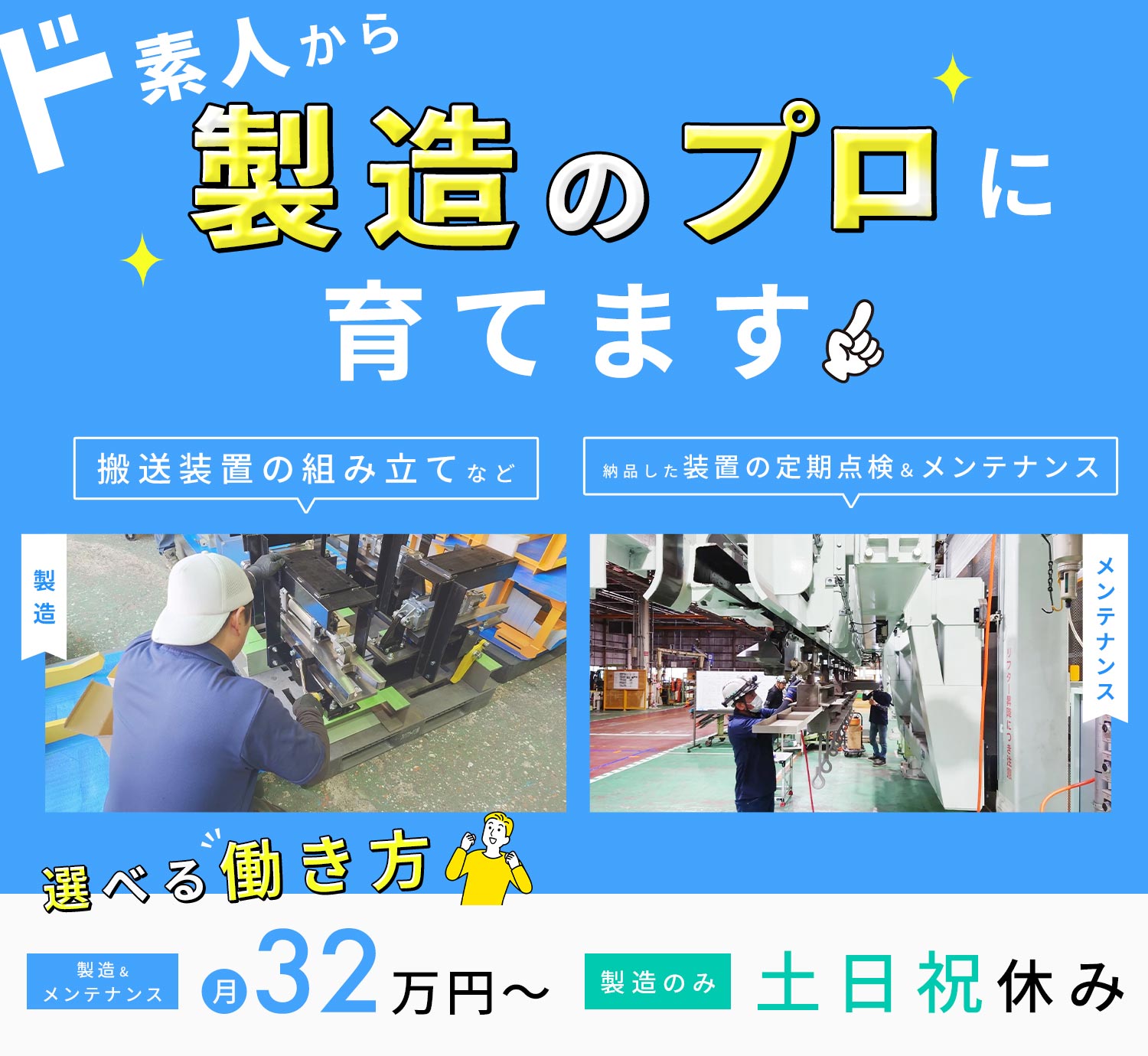 | 応募資格 | 無資格・未経験OK ※製造が初めての方、異業種からの転職大歓迎 ※男女・学歴不問 ※第二新卒歓迎 ※下記のような製造に関する実務経験・資格をお持ちの方は優遇 ・溶接経験 ・電気工事士資格 ・フォークリフト免許 など |