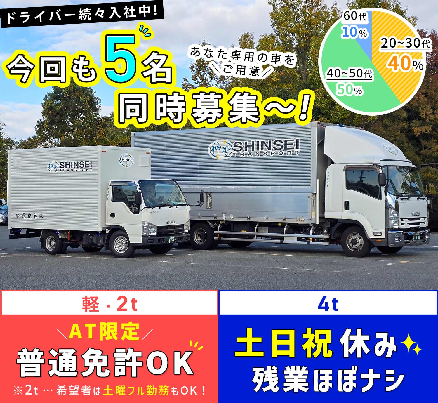 当社では20代~60代のドライバーが活躍しており、40代以上が約6割☆