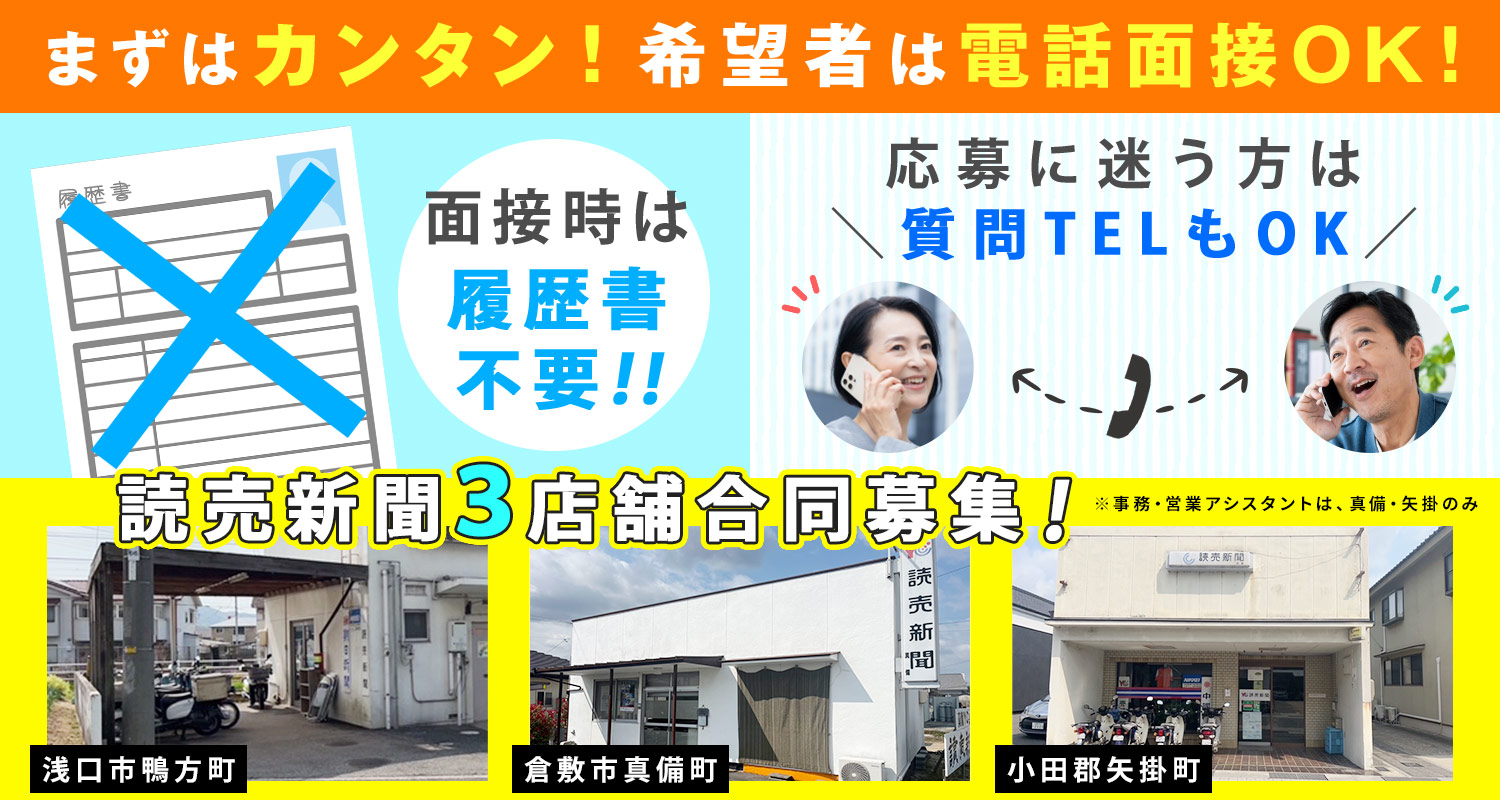 新聞販売店での、電話対応、書類整理をはじめ、軽自動車(箱バン)を運転し、営業スタッフの送迎や、ポスティング等をお願いします。