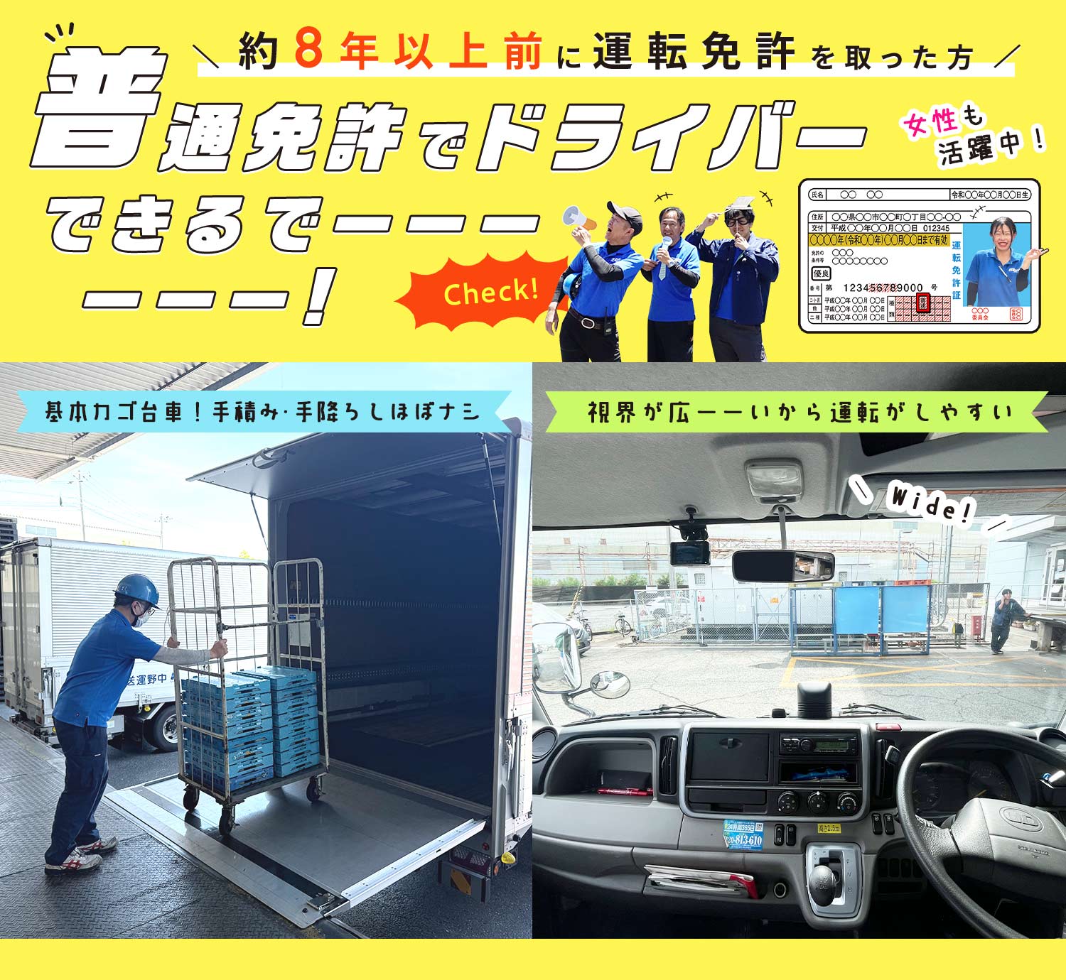 応募資格 | 要普通自動車免許(MT) ※AT限定の方も、ご相談ください ※平成29年(2017年)3月12日以降に取得された方は、要準中型免許(中型免許取得支援あり) ※未経験OK!異業種からの転職も歓迎 ※男女OK ※60歳定年のため、60歳未満の方(定年後再雇用制度あり) |