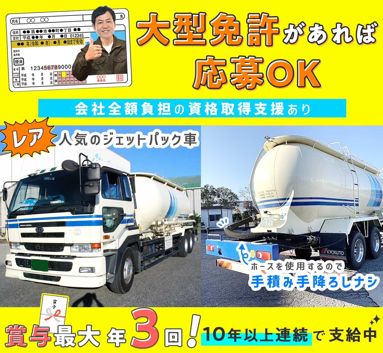 ジェットパック車を運転し、粉粒体の地場輸送をお願いします。
