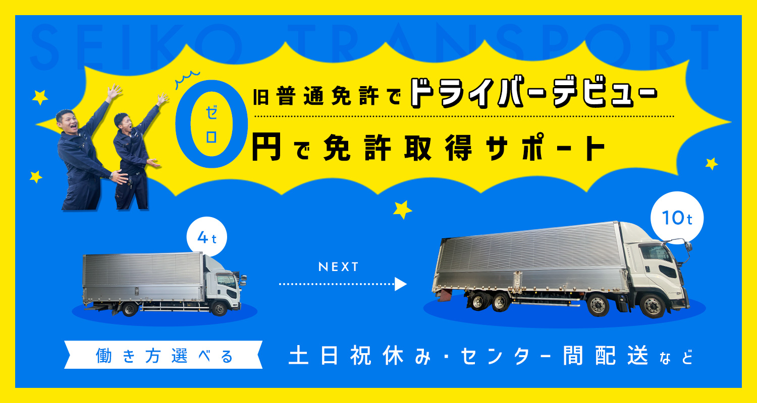 | 応募資格 | 旧普通免許でOK! ※平成19年(2007年)6月1日以前に普通免許を取得した方 平成19年(2007年)6月2日以降に普通免許を取得の方は要中型免許 ※ドライバー未経験OK ※男女不問 ※学歴不問 ※シニアやミドルも歓迎 ※入社後、大型免許の取得も可能(全額会社負担) |