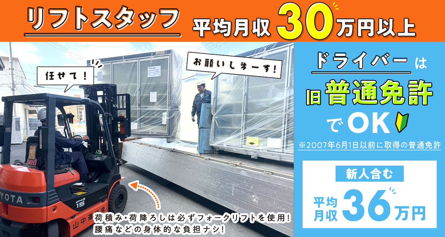 | 仕事内容 | シニアやミドルも歓迎のドライバー[社] 大型空調機器やショーケースなどの配送。 関西圏内の現場や店舗を回ります。(1日1~2件程度) ※荷積み・荷降ろしは、専属のリフト作業員が担当。 少しサポートをお願いすることもありますが、負担少なく働けます。 <仕事の流れ> 08:00 出勤・配送先へ出発(1~2件) 16:30 帰社・積み込み作業(専属リフト作業員のサポート) 17:00 退勤 □□□ <ドライバー未経験者も大歓迎> 入社後は先輩の運転の横に乗って、丁寧に研修。積み込みや荷締めなどイチからお教えします◎ |