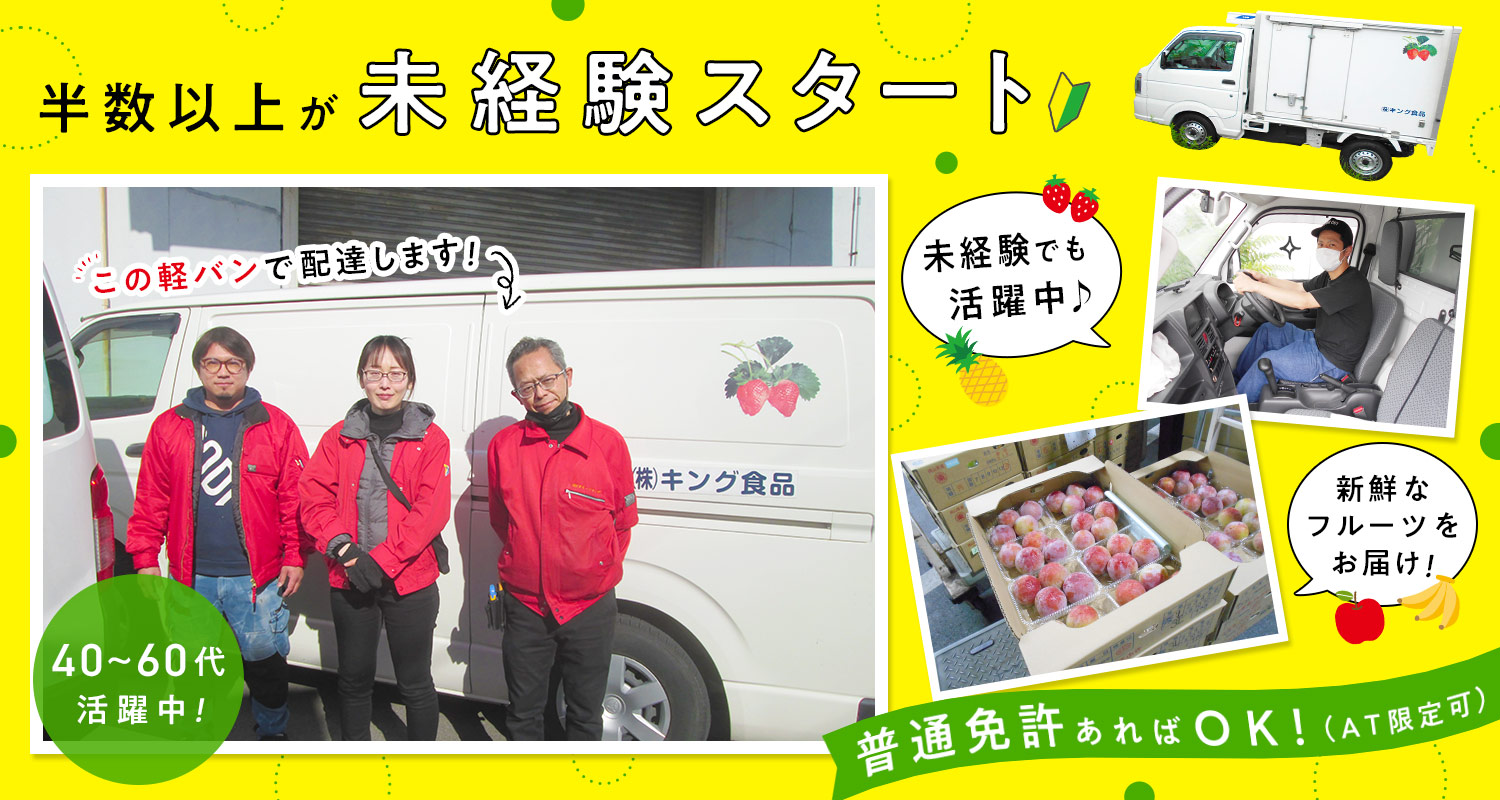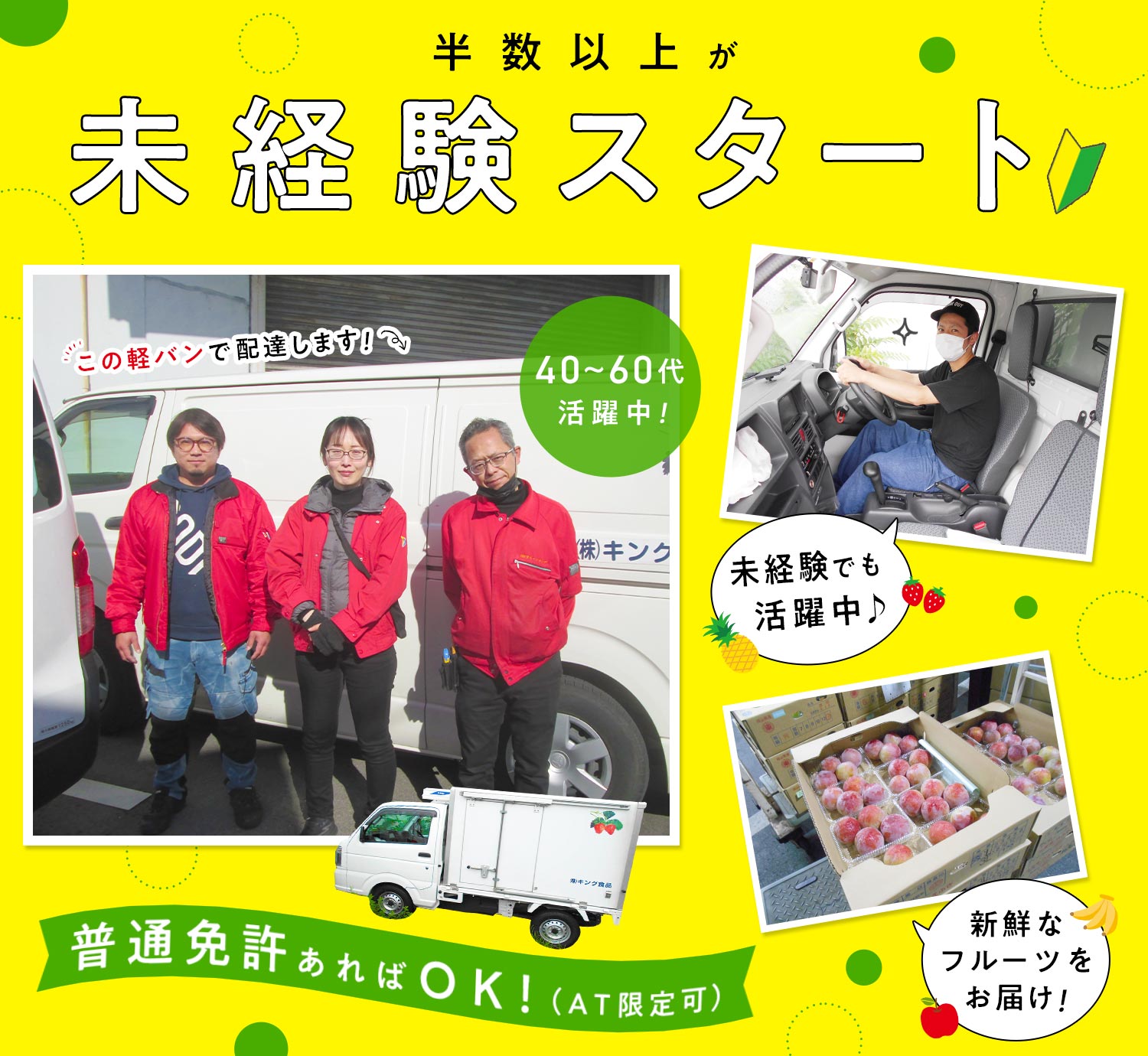 | 仕事内容 | ルート配送ドライバー/軽作業や製造などから転職OK[社] 軽バンやワゴン車に乗り、フルーツの配送をお願いします。 ・配送エリア…大阪・兵庫・京都など関西メイン ・配送先…ホテル、レストラン、洋菓子店など1日平均10件 □□□ <1日のスケジュール例> 4:00 出勤 4:30 卸市場で荷物をピッキング後、積込み 5:00 配送へ出発 ~途中に休憩~ 12:30 全ての配達完了後、事務所へ 13:00 片付けや事務処理をして退勤、お疲れさまでした! |
