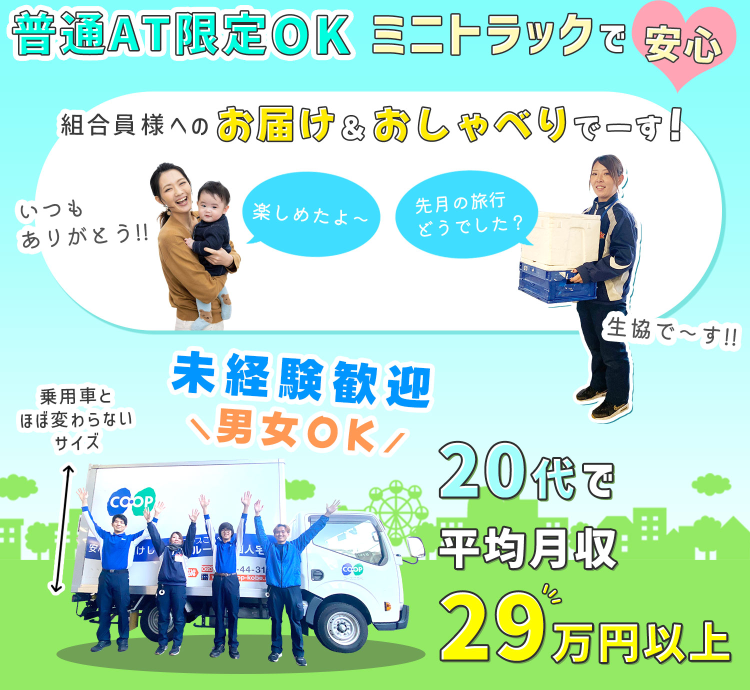 | 仕事内容 | 会員専属のミニトラックドライバー/軽作業や事務等からも転職OK[社] 当社の配送ドライバーとして、コープこうべの組合員様に対する生協商品の配送をお任せします。 ※決まったコースのルート配送です。 ※再配達ナシ!! 配送件数:1日約50件(コースによって異なる) エリア:半径1Km程度の狭いエリア ※担当コースは3年毎に変更予定 □□□ <1日のスケジュール例> Aコース 07:30~ 積み込み作業 09:00~ 配送スタート(約50軒ほど) 12:30~ お昼休憩 17:00~ 配送終了後、注文書の処理 19:30~ 退勤 Bコース 07:30~ 積み込み作業 09:00~ 配送スタート(約50軒ほど) 12:30~ お昼休憩 17:00~ 配送終了後、注文書の処理 16:00~ 退勤 |