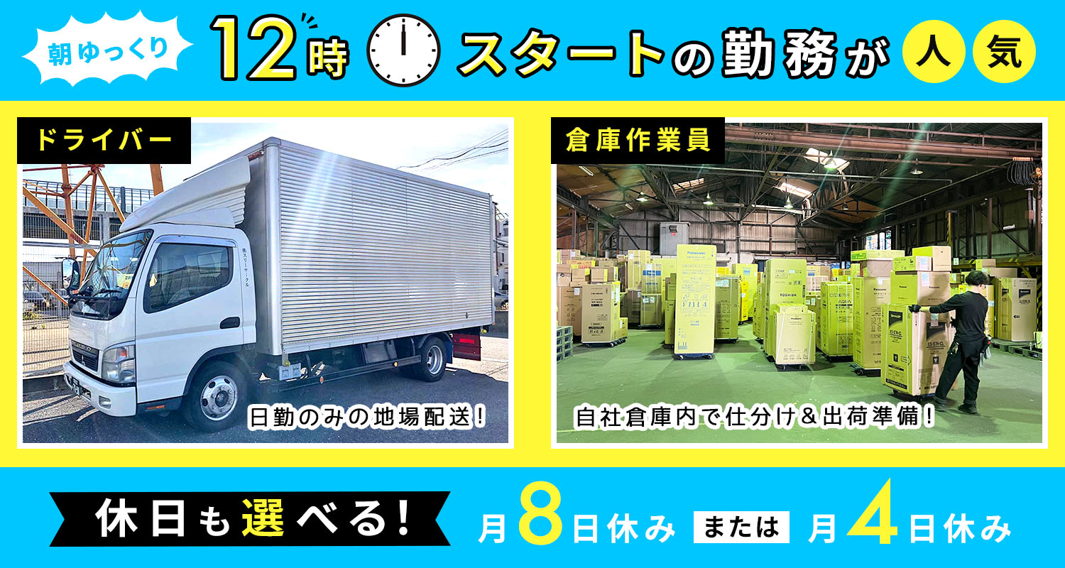 | 仕事内容 | (1)ドライバー・月8日休み/軽作業や製造などから転職OK[社] (2)ミドルも歓迎のドライバー/月4日休み[社] 4tトラック(パワーゲート車)を運転し、神戸市(六甲)のセンターまで荷物の集荷をお願いします。 ※集荷は、高速道路を使い、1日2往復のみ ※当社(門真市)を出発し、兵庫県神戸市の六甲にあるセンターへ荷物(家電等)を集荷 ※ルートも毎日固定で、最寄りのICから高速道路を利用するので、運転のストレスもナシ!接客もないので、コミュニケーションが苦手な方でも大丈夫◎ |