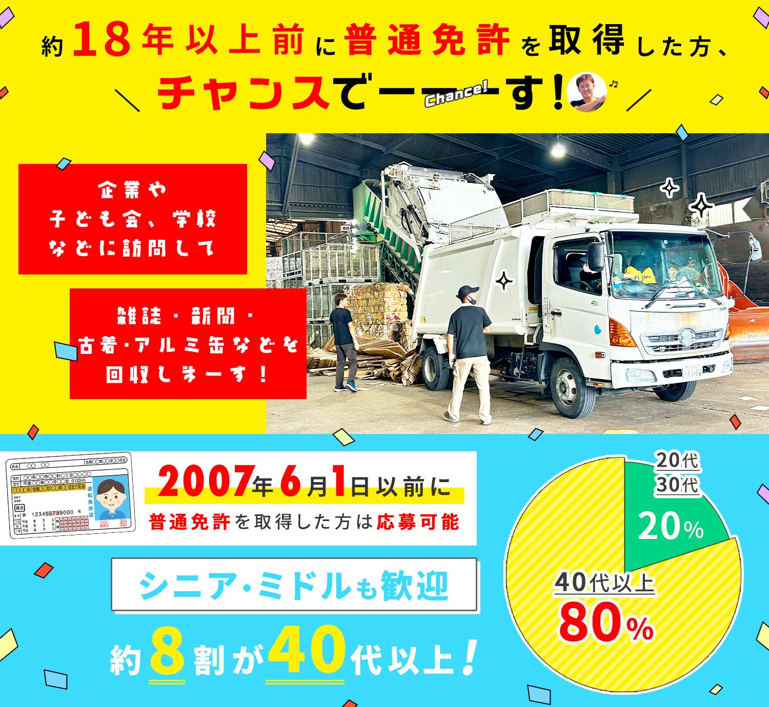 | 応募資格 | 普通自動車免許をお持ちの方(AT限定不可) ※平成19年(2007年)6月2日以降の免許取得者は、入社後に中型自動車免許を取得していただきます!(資格取得支援制度あり) ※ドライバー未経験もOK ※ブランクOK ※シニアやミドルも歓迎 |