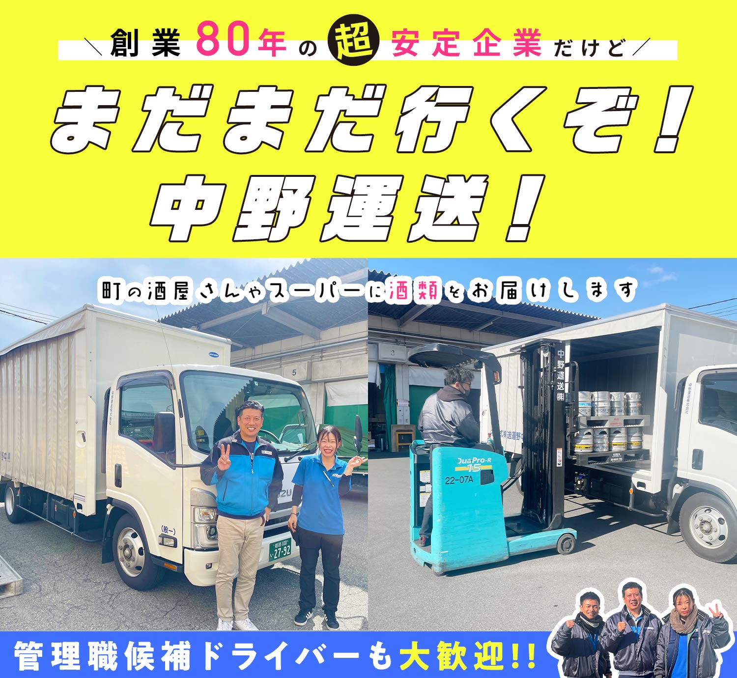 | 待 遇 | #賞与あり 年2回 #昇給あり 年1回 #昇格あり 社会保険完備 #車通勤OK (駐車場無料) バイク通勤OK 資格取得支援あり (リフト免許、費用全額支給) 制服貸与 休憩所あり 個別ロッカーあり 社割販売 (ビール・調味料など) プロバスケットボールチーム「大阪エヴェッサオフィシャルスポンサー」※観戦無料 研修制度あり ※入社後1週間~10日は横乗り研修にて、ルートを覚えたり、積み方や伝票の書き方など丁寧にお教えします。 |